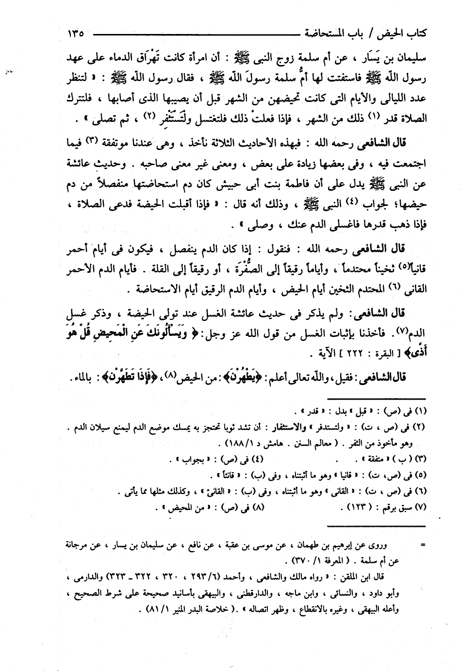 قَالَ الشَّافِعِيُّ : فَبِهَذِهِ الْأَحَادِيثِ الثَّلاَثَةِ نَأْخُذُ وَهِيَ عِنْدَنَا مُتَّفِقَةٌ فِيمَا اجْتَمَعَتْ فِيهِ وَفِي بَعْضِهَا زِيَادَةٌ عَلَى بَعْضٍ وَمَعْنًى غَيْرُ مَعْنَى صَاحِبِهِ وَحَدِيثُ عَائِشَةَ عَنْ النَّبِيِّ - صلى الله عليه وسلم - يَدُلُّ عَلَى أَنَّ فَاطِمَةَ بِنْتَ أَبِي حُبَيْشٍ كَانَ دَمُ اسْتِحَاضَتِهَا مُنْفَصِلاً مِنْ دَمِ حَيْضِهَا لِجَوَابِ النَّبِيِّ - صلى الله عليه وسلم - وَذَلِكَ أَنَّهُ قَالَ { : فَإِذَا أَقْبَلَتْ الْحَيْضَةُ فَدَعِي الصَّلاَةَ فَإِذَا ذَهَبَ قَدْرُهَا فَاغْسِلِي الدَّمَ عَنْكِ وَصَلِّي ? .