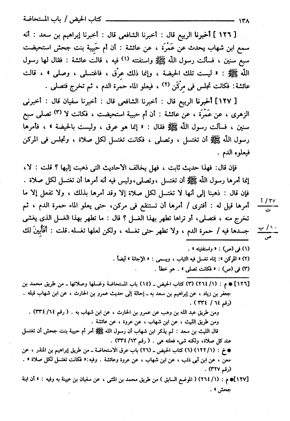 أَخْبَرَنَا الرَّبِيعُ قَالَ أَخْبَرَنَا الشَّافِعِيُّ قَالَ أَخْبَرَنَا إبْرَاهِيمُ بْنُ سَعْدٍ أَنَّهُ سَمِعَ ابْنَ شِهَابٍ يُحَدِّثُ عَنْ عَمْرَةَ عَنْ عَائِشَةَ أَنَّ { أُمَّ حَبِيبَةَ بِنْتَ جَحْشٍ اُسْتُحِيضَتْ سَبْعَ سِنِينَ فَسَأَلَتْ رَسُولَ اللَّهِ - صلى الله عليه وسلم - وَاسْتَفْتَتْهُ فِيهِ قَالَتْ عَائِشَةُ فَقَالَ لَهَا رَسُولُ اللَّهِ - صلى الله عليه وسلم - لَيْسَتْ تِلْكَ الْحَيْضَةُ وَإِنَّمَا ذَلِكَ عِرْقٌ فَاغْتَسِلِي وَصَلِّي قَالَتْ عَائِشَةُ فَكَانَتْ تَجْلِسُ فِي مِرْكَنٍ فَيَعْلُو الْمَاءَ حُمْرَةُ الدَّمِ , ثُمَّ تَخْرُجُ فَتُصَلِّي ? أَخْبَرَنَا الرَّبِيعُ قَالَ أَخْبَرَنَا الشَّافِعِيُّ قَالَ أَخْبَرَنَا سُفْيَانُ قَالَ أَخْبَرَنِي الزُّهْرِيُّ عَنْ عَمْرَةَ عَنْ عَائِشَةَ { أَنَّ أُمَّ حَبِيبَةَ اُسْتُحِيضَتْ فَكَانَتْ لاَ تُصَلِّي سَبْعَ سِنِينَ فَسَأَلَتْ رَسُولَ اللَّهِ - صلى الله عليه وسلم - فَقَالَ إنَّمَا هُوَ عِرْقٌ وَلَيْسَتْ بِالْحَيْضَةِ فَأَمَرَهَا رَسُولُ اللَّهِ - صلى الله عليه وسلم - أَنْ تَغْتَسِلَ وَتُصَلِّيَ فَكَانَتْ تَغْتَسِلُ لِكُلِّ صَلاَةٍ وَتَجْلِسُ فِي الْمِرْكَنِ فَيَعْلُوهُ الدَّمُ ? . فَإِنْ قَالَ فَهَذَا حَدِيثٌ ثَابِتٌ فَهَلْ يُخَالِفُ الْأَحَادِيثَ الَّتِي ذَهَبْت إلَيْهَا ؟ قُلْت : لاَ إنَّمَا أَمَرَهَا رَسُولُ اللَّهِ - صلى الله عليه وسلم - أَنْ تَغْتَسِلَ وَتُصَلِّيَ وَلَيْسَ فِيهِ أَنَّهُ أَمَرَهَا أَنْ تَغْتَسِلَ لِكُلِّ صَلاَةٍ فَإِنْ قَالَ ذَهَبْنَا إلَى أَنَّهَا لاَ تَغْتَسِلُ لِكُلِّ صَلاَةٍ إلَّا وَقَدْ أَمَرَهَا بِذَلِكَ وَلاَ تَفْعَلُ إلَّا مَا أَمَرَهَا قِيلَ لَهُ أَفَتَرَى أَمْرَهَا أَنْ تَسْتَنْقِعَ فِي مِرْكَنٍ حَتَّى يَعْلُوَ الْمَاءَ حُمْرَةُ الدَّمِ , ثُمَّ تَخْرُجَ مِنْهُ فَتُصَلِّي , أَوْ تَرَاهَا تَطْهُرُ بِهَذَا الْغُسْلِ قَالَ مَا تَطْهُرُ بِهَذَا الْغُسْلِ الَّذِي يَغْشَى جَسَدَهَا فِيهِ حُمْرَةُ الدَّمِ وَلاَ تَطْهُرُ حَتَّى تَغْسِلَهُ وَلَكِنْ لَعَلَّهَا تَغْسِلُهُ قُلْت أَفَأُبَيِّنُ لَكَ@