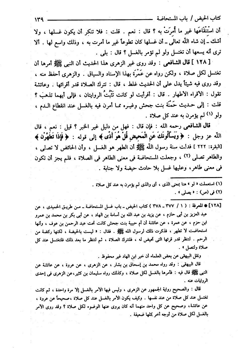 قَالَ الشَّافِعِيُّ : وَقَدْ رَوَى غَيْرُ الزُّهْرِيِّ هَذَا الْحَدِيثَ { أَنَّ النَّبِيَّ - صلى الله عليه وسلم - أَمَرَهَا أَنْ تَغْتَسِلَ لِكُلِّ صَلاَةٍ ? وَلَكِنْ رَوَاهُ عَنْ عَمْرَةَ بِهَذَا الْإِسْنَادِ وَالسِّيَاقِ وَالزُّهْرِيُّ أَحْفَظُ مِنْهُ وَقَدْ رَوَى فِيهِ شَيْئًا يَدُلُّ عَلَى أَنَّ الْحَدِيثَ غَلَطٌ قَالَ تَتْرُكُ الصَّلاَةَ قَدْرَ أَقْرَائِهَا وَعَائِشَةُ تَقُولُ الْأَقْرَاءُ الْأَطْهَارُ قَالَ أَفَرَأَيْت لَوْ كَانَ تَثْبُتُ الرِّوَايَتَانِ فَإِلَى أَيِّهِمَا تَذْهَبُ ؟ قُلْت إلَى حَدِيثِ حَمْنَةَ بِنْتِ جَحْشٍ وَغَيْرِهِ مِمَّا أُمِرْنَ فِيهِ بِالْغُسْلِ عِنْدَ انْقِطَاعِ الدَّمِ وَلَوْ لَمْ يُؤْمَرْنَ بِهِ عِنْدَ كُلِّ صَلاَةٍ .