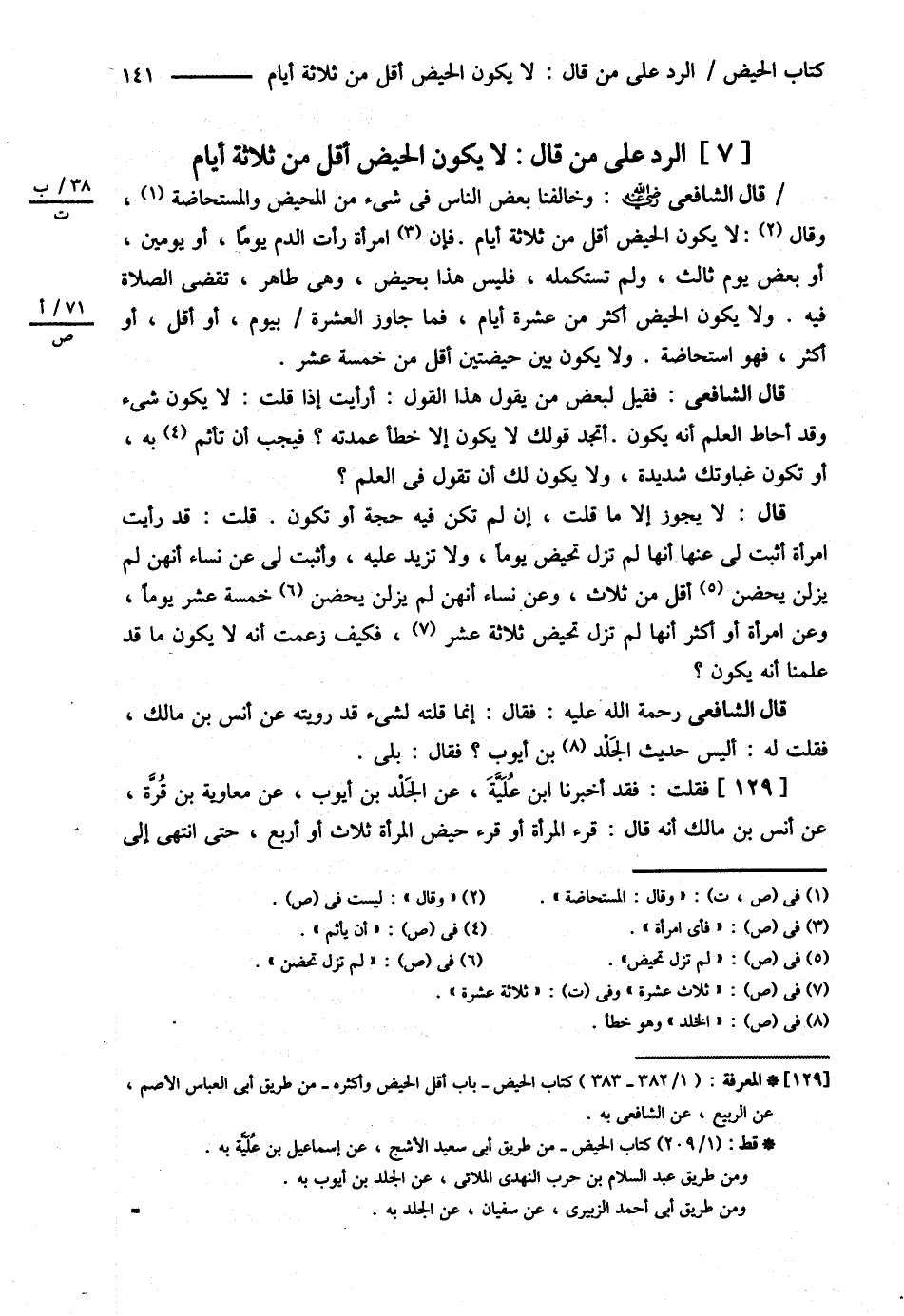 قَالَ الشَّافِعِيُّ : فَقَالَ إنَّمَا قُلْتُهُ لِشَيْءٍ قَدْ رَوَيْته عَنْ أَنَسِ بْنِ مَالِكٍ فَقُلْت لَهُ أَلَيْسَ حَدِيثُ الْجَلْدِ بْنِ أَيُّوبَ فَقَالَ بَلَى فَقُلْت فَقَدْ أَخْبَرَنِي ابْنُ عُلَيَّةَ عَنْ الْجَلْدِ بْنِ أَيُّوبَ عَنْ مُعَاوِيَةَ بْنِ قُرَّةَ عَنْ أَنَسِ بْنِ مَالِكٍ أَنَّهُ قَالَ قُرْءُ الْمَرْأَةِ , أَوْ قُرْءُ حَيْضِ الْمَرْأَةِ ثَلاَثٌ أَوْ أَرْبَعٌ حَتَّى انْتَهَى إلَى@