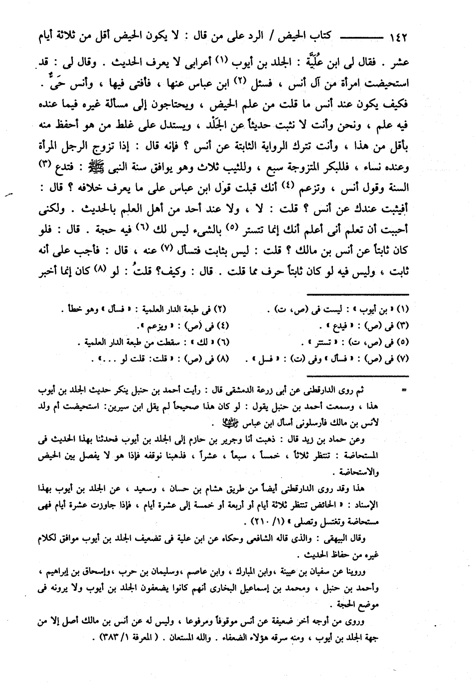 عَشْرٍ فَقَالَ لِي ابْنُ عُلَيَّةَ الْجَلْدُ بْنُ أَيُّوبَ أَعْرَابِيٌّ لاَ يَعْرِفُ الْحَدِيثَ , وَقَالَ لِي قَدْ اُسْتُحِيضَتْ امْرَأَةٌ مِنْ آلِ أَنَسٍ فَسُئِلَ ابْنُ عَبَّاسٍ عَنْهَا فَأَفْتَى فِيهَا وَأَنَسٌ حَيٌّ فَكَيْفَ يَكُونُ عِنْدَ أَنَسٍ مَا قُلْت مِنْ عِلْمِ الْحَيْضِ وَيَحْتَاجُونَ إلَى مَسْأَلَةِ غَيْرِهِ فِيمَا عِنْدَهُ فِيهِ عِلْمٌ وَنَحْنُ وَأَنْتَ لاَ نُثْبِتُ حَدِيثًا عَنْ الْجَلْدِ وَيُسْتَدَلُّ عَلَى غَلَطِ مَنْ هُوَ أَحْفَظُ مِنْهُ بِأَقَلَّ مِنْ هَذَا وَأَنْتَ تَتْرُكُ الرِّوَايَةَ الثَّابِتَةَ عَنْ أَنَسٍ فَإِنَّهُ قَالَ : إذَا تَزَوَّجَ الرَّجُلُ الْمَرْأَةَ وَعِنْدَهُ نِسَاءٌ فَلِلْبِكْرِ الْمُتَزَوِّجَةِ سَبْعٌ وَلِلثَّيِّبِ ثَلاَثٌ وَهُوَ يُوَافِقُ سُنَّةَ النَّبِيِّ - صلى الله عليه وسلم - فَتَدَعُ السُّنَّةَ وَقَوْلَ أَنَسٍ وَتَزْعُمُ أَنَّكَ قَبِلْت قَوْلَ ابْنِ عَبَّاسٍ عَلَى مَا يُعْرَفُ خِلاَفُهُ , قَالَ أَفَيَثْبُتُ عِنْدَك عَنْ أَنَسٍ ؟ قُلْت : لاَ وَلاَ عِنْدَ أَحَدٍ مِنْ أَهْلِ الْعِلْمِ بِالْحَدِيثِ وَلَكِنِّي أَحْبَبْت أَنْ تَعْلَمَ أَنِّي أَعْلَمُ أَنَّك إنَّمَا تَتَسَتَّرُ بِالشَّيْءِ لَيْسَتْ لَكَ فِيهِ حُجَّةٌ قَالَ فَلَوْ كَانَ ثَابِتًا عَنْ أَنَسِ بْنِ مَالِكٍ . ( قُلْت ) لَيْسَ بِثَابِتٍ فَتَسْأَلُ عَنْهُ قَالَ فَأَجِبْ عَلَى أَنَّهُ ثَابِتٌ . وَلَيْسَ فِيهِ لَوْ كَانَ ثَابِتًا حَرْفٌ مِمَّا قُلْتَ قَالَ : وَكَيْفَ ؟ قُلْتُ : لَوْ كَانَ إنَّمَا أَخْبَرَ@