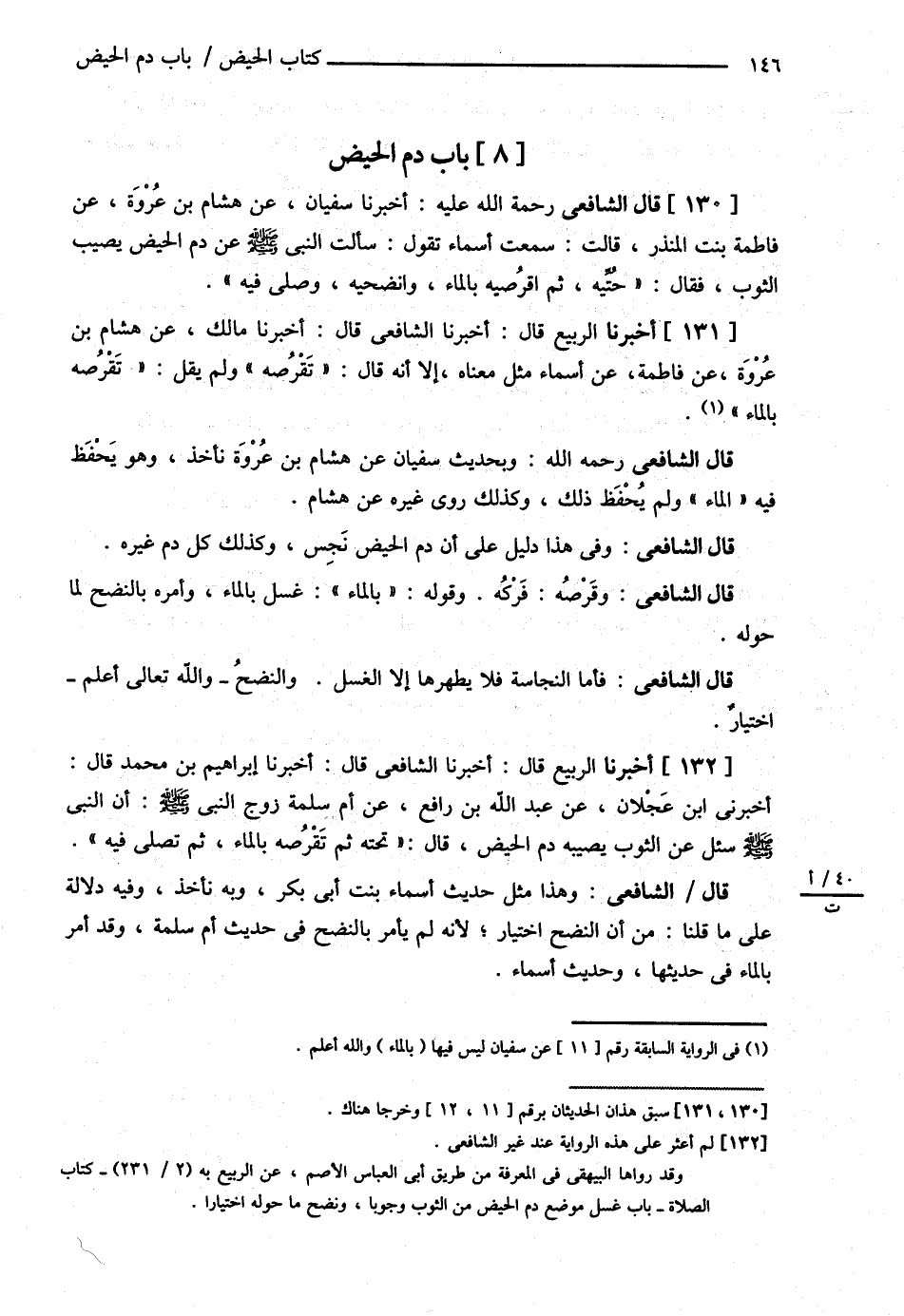 قَالَ الشَّافِعِيُّ : رحمه الله تعالى أَخْبَرَنَا سُفْيَانُ عَنْ هِشَامِ بْنِ عُرْوَةَ عَنْ فَاطِمَةَ بِنْتِ الْمُنْذِرِ قَالَتْ { سَمِعْت أَسْمَاءَ تَقُولُ سَأَلَتْ النَّبِيَّ - صلى الله عليه وسلم - عَنْ دَمِ الْحَيْضِ يُصِيبُ الثَّوْبَ فَقَالَ حُتِّيهِ , ثُمَّ اُقْرُصِيهِ بِالْمَاءِ وَانْضَحِيهِ وَصَلِّي فِيهِ ? أَخْبَرَنَا الرَّبِيعُ قَالَ أَخْبَرَنَا الشَّافِعِيُّ قَالَ أَخْبَرَنَا مَالِكٌ عَنْ هِشَامِ بْنِ عُرْوَةَ عَنْ فَاطِمَةَ عَنْ أَسْمَاءَ مِثْلَ مَعْنَاهُ إلَّا أَنَّهُ قَالَ تَقْرُصُهُ وَلَمْ يَقُلْ تَقْرُصُهُ بِالْمَاءِ