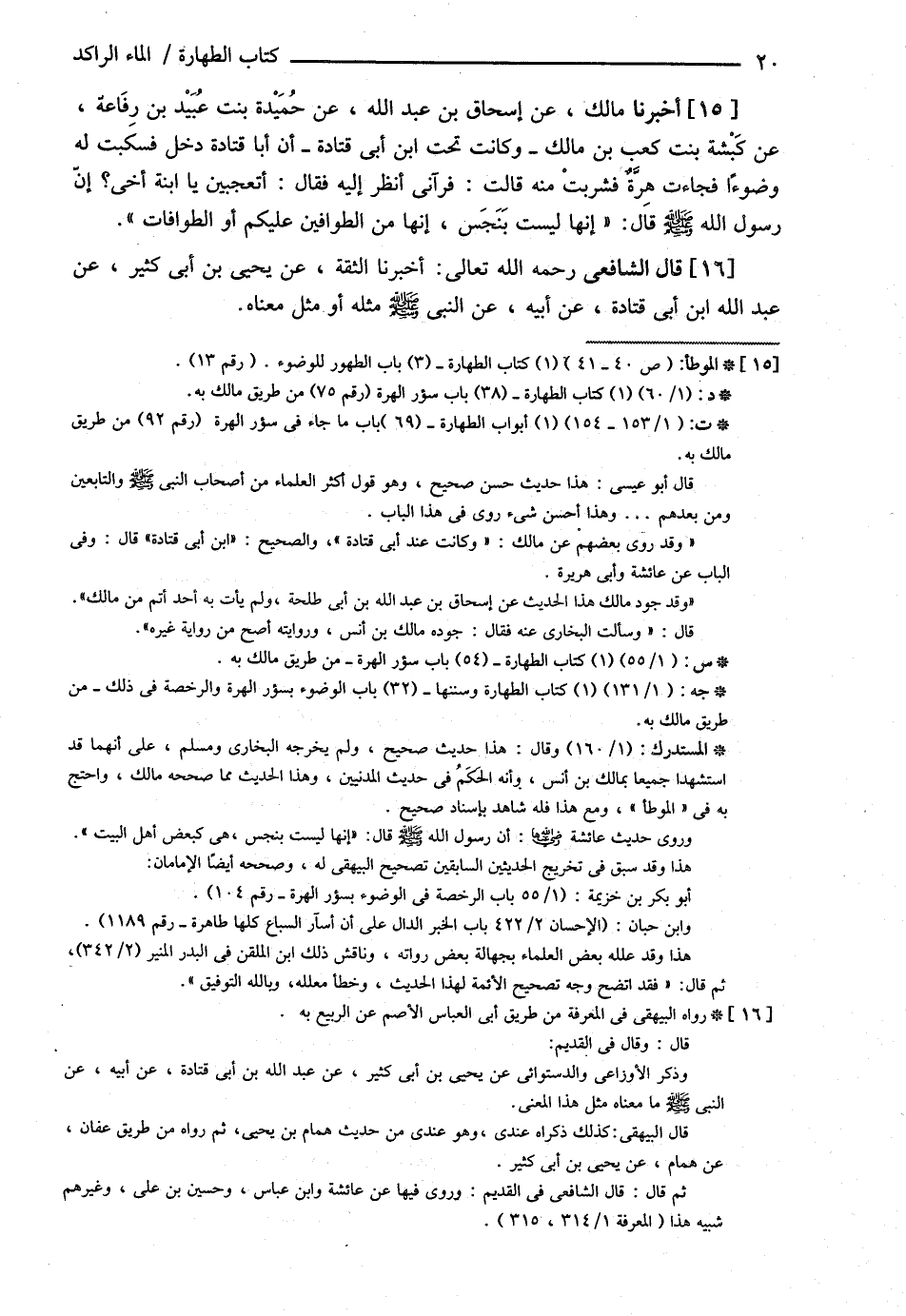 أَخْبَرَنَا مَالِكٌ عَنْ إِسْحَاقَ بْنِ عَبْدِ اللَّهِ عَنْ حَمِيدَةَ بِنْتِ عُبَيْدِ بْنِ رِفَاعَةَ { عَنْ كَبْشَةَ بِنْتِ كَعْبِ بْنِ مَالِكٍ , وَكَانَتْ تَحْتَ ابْنِ أَبِي قَتَادَةَ أَنَّ أَبَا قَتَادَةَ دَخَلَ فَسَكَبَتْ لَهُ وُضُوءًا فَجَاءَتْ هِرَّةٌ فَشَرِبَتْ مِنْهُ قَالَتْ : فَرَآنِي أَنْظُرُ إلَيْهِ فَقَالَ أَتَعْجَبِينَ يَا ابْنَةَ أَخِي إنَّ رَسُولَ اللَّهِ - صلى الله عليه وسلم - قَالَ إنَّهَا لَيْسَتْ بِنَجَسٍ إنَّهَا مِنْ الطَّوَّافِينَ عَلَيْكُمْ أَوْ الطَّوَّافَاتِ ? .
