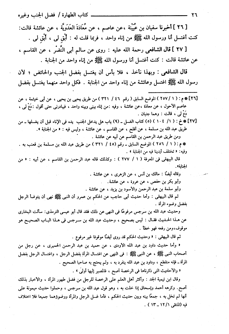 قَالَ الشَّافِعِيُّ : وَبِهَذَا نَأْخُذُ فَلاَ بَأْسَ أَنْ يَغْتَسِلَ بِفَضْلِ الْجُنُبِ , وَالْحَائِضِ ; لِأَنَّ رَسُولَ اللَّهِ - صلى الله عليه وسلم - اغْتَسَلَ وَعَائِشَةَ مِنْ إنَاءٍ وَاحِدٍ مِنْ الْجَنَابَةِ فَكُلُّ وَاحِدٍ مِنْهُمَا يَغْتَسِلُ بِفَضْلِ@
