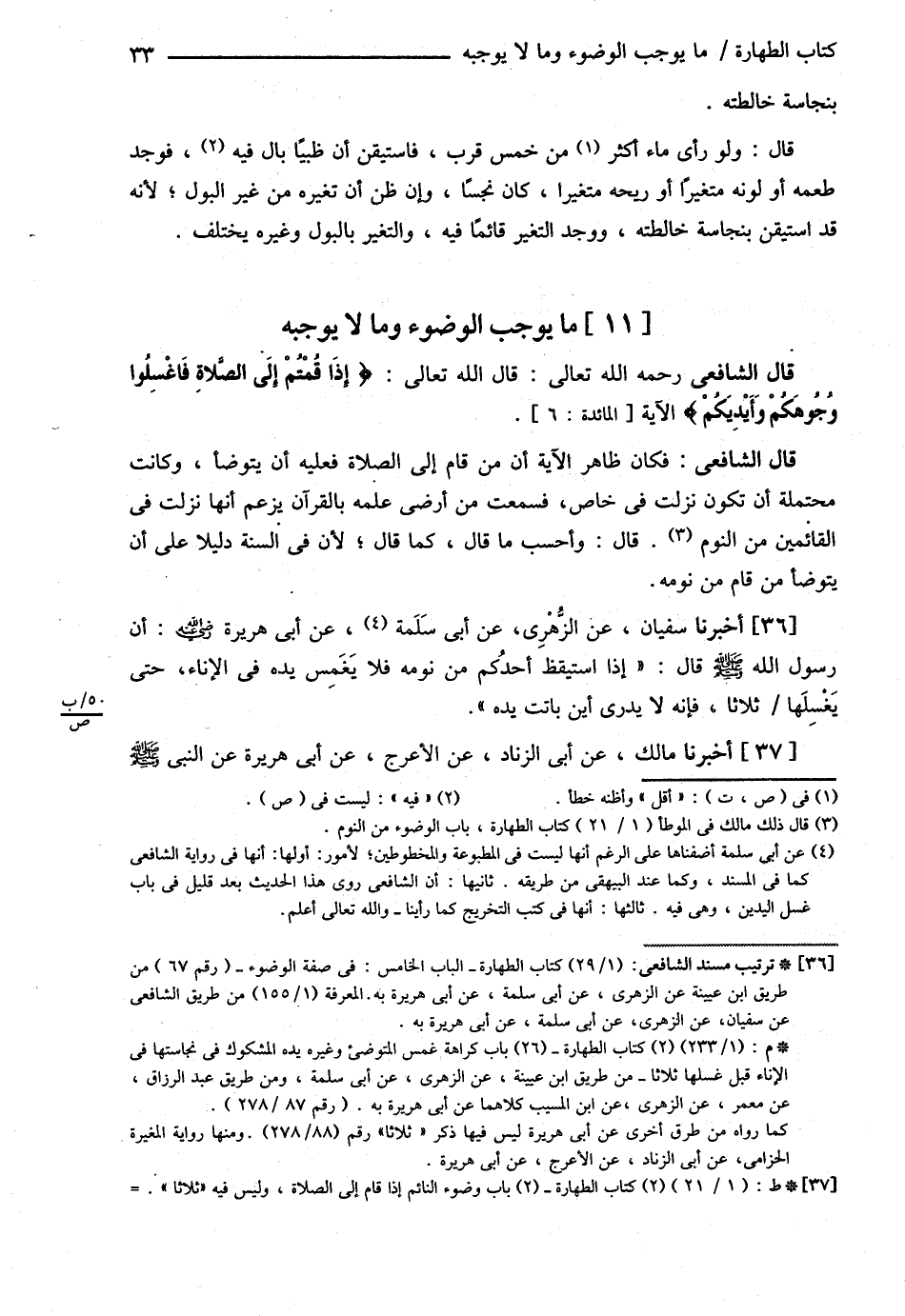 قال : وَأَحْسَبُ مَا قَالَ كَمَا قَالَ ; لِأَنَّ فِي السُّنَّةِ دَلِيلاً عَلَى أَنْ يَتَوَضَّأَ مَنْ قَامَ مِنْ نَوْمِهِ أَخْبَرَنَا سُفْيَانُ عَنْ الزُّهْرِيِّ عَنْ أَبِي هُرَيْرَةَ رضي الله عنه " أَنَّ رَسُولَ اللَّهِ - صلى الله عليه وسلم - قَالَ { إذَا اسْتَيْقَظَ أَحَدُكُمْ مِنْ نَوْمِهِ فَلاَ يَغْمِسْ يَدَهُ فِي الْإِنَاءِ حَتَّى يَغْسِلَهَا ثَلاَثًا فَإِنَّهُ لاَ يَدْرِي أَيْنَ بَاتَتْ يَدُهُ ? أَخْبَرَنَا مَالِكٌ عَنْ أَبِي الزِّنَادِ عَنْ الْأَعْرَجِ عَنْ أَبِي هُرَيْرَةَ عَنْ النَّبِيِّ - صلى الله عليه وسلم -@