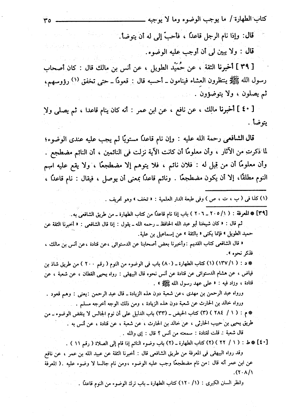 قال : وَلاَ يَبِينُ لِي أَنْ أُوجِبَ عَلَيْهِ الْوُضُوءَ , أَخْبَرَنَا الثِّقَةُ عَنْ حُمَيْدٍ الطَّوِيلِ عَنْ أَنَسِ بْنِ مَالِكٍ قَالَ كَانَ أَصْحَابُ رَسُولِ اللَّهِ - صلى الله عليه وسلم - يَنْتَظِرُونَ الْعِشَاءَ فَيَنَامُونَ أَحْسَبُهُ قَالَ قُعُودًا حَتَّى تَخْفِقَ رُءُوسُهُمْ ثُمَّ يُصَلُّونَ وَلاَ يَتَوَضَّئُونَ أَخْبَرَنَا مَالِكٌ عَنْ نَافِعٍ عَنْ ابْنِ عُمَرَ أَنَّهُ كَانَ يَنَامُ قَاعِدًا ثُمَّ يُصَلِّي وَلاَ يَتَوَضَّأُ . .
