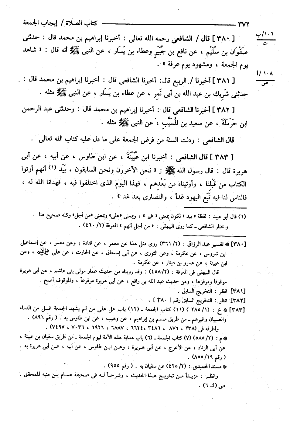 قَالَ الشَّافِعِيُّ: أَخْبَرَنَا ابْنُ عُيَيْنَةَ عَنْ ابْنِ طَاوُسٍ عَنْ أَبِيهِ عَنْ أَبِي هُرَيْرَةَ قَالَ: قَالَ رَسُولُ اللَّهِ - صلى الله عليه وسلم - {نَحْنُ الْآخَرُونَ وَنَحْنُ السَّابِقُونَ بَيْدَ أَنَّهُمْ أُوتُوا الْكِتَابَ مِنْ قَبْلِنَا وَأُوتِينَاهُ مِنْ بَعْدِهِمْ فَهَذَا الْيَوْمُ الَّذِي اخْتَلَفُوا فِيهِ فَهَدَانَا اللَّهُ لَهُ فَالنَّاسُ لَنَا فِيهِ تَبَعٌ الْيَهُودُ غَدًا وَالنَّصَارَى بَعْدَ غَدٍ} @