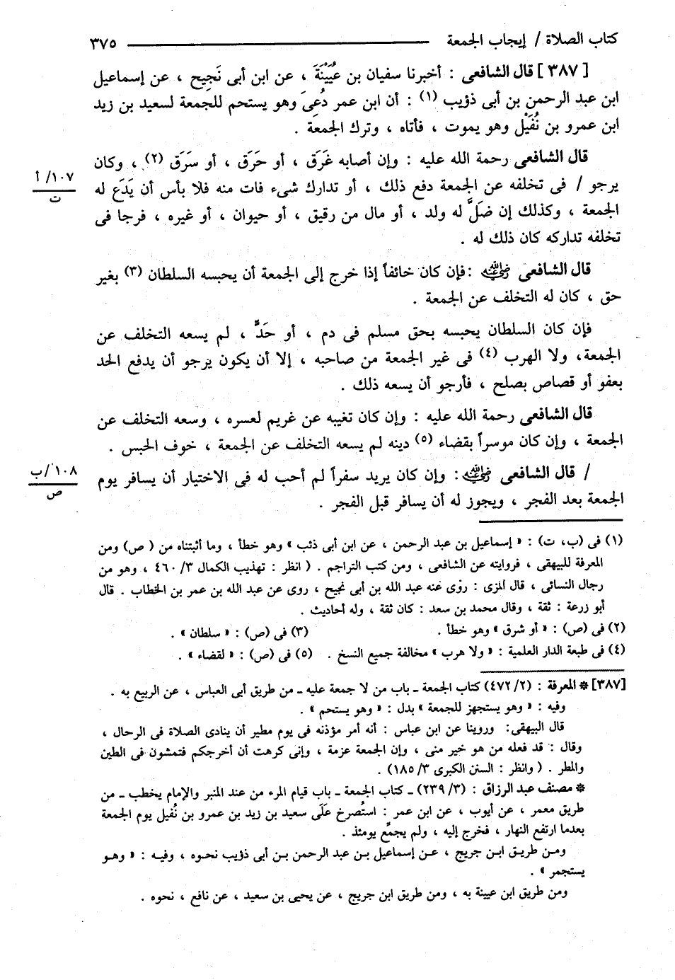 قَالَ الشَّافِعِيُّ : أَخْبَرَنَا سُفْيَانُ بْنُ عُيَيْنَةَ عَنْ ابْنِ أَبِي نَجِيحٍ عَنْ إسْمَاعِيلَ بْنِ عَبْدِ الرَّحْمَنِ عَنْ ابْنِ أَبِي ذِئْبٍ أَنَّ ابْنَ عُمَرَ دُعِيَ وَهُوَ يَسْتَحِمُّ لِلْجُمَعَةِ لِسَعِيدِ بْنِ زَيْدِ بْنِ عَمْرِو بْنِ نُفَيْلٍ وَهُوَ يَمُوتُ فَأَتَاهُ وَتَرَكَ الْجُمُعَةَ , ( قَالَ : الشَّافِعِيُّ ) : وَإِنْ أَصَابَهُ غَرَقٌ , أَوْ حَرْقٌ , أَوْ سُرِقَ وَكَانَ يَرْجُو فِي تَخَلُّفِهِ عَنْ الْجُمُعَةِ دَفْعَ ذَلِكَ , أَوْ تَدَارُكَ شَيْءٍ فَلَتَ مِنْهُ فَلاَ بَأْسَ أَنْ يَدَعَ لَهُ الْجُمُعَةَ وَكَذَلِكَ إنْ ضَلَّ لَهُ وَلَدٌ , أَوْ مَالٌ مِنْ رَقِيقٍ , أَوْ حَيَوَانٍ أَوْ غَيْرِهِ فَرَجَا فِي تَخَلُّفِهِ تَدَارُكَهُ كَانَ ذَلِكَ لَهُ .