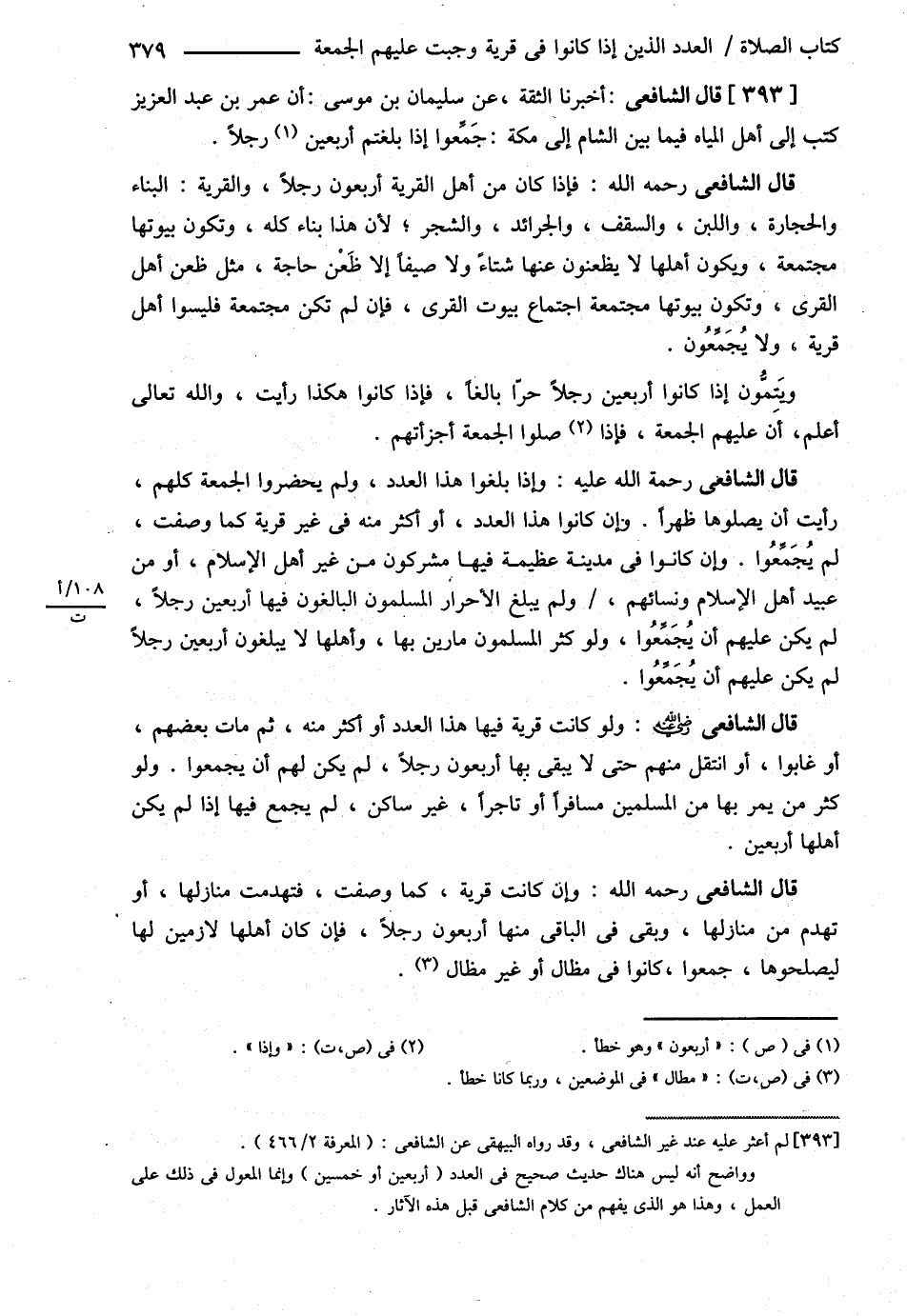 قَالَ : قَالَ الشَّافِعِيُّ أَخْبَرَنَا الثِّقَةُ عَنْ سُلَيْمَانَ بْنِ مُوسَى أَنَّ عُمَرَ بْنَ عَبْدِ الْعَزِيزِ كَتَبَ إلَى أَهْلِ الْمِيَاهِ فِيمَا بَيْنَ الشَّامِ إلَى مَكَّةَ جَمَعُوا إذَا بَلَغْتُمْ أَرْبَعِينَ رَجُلاً