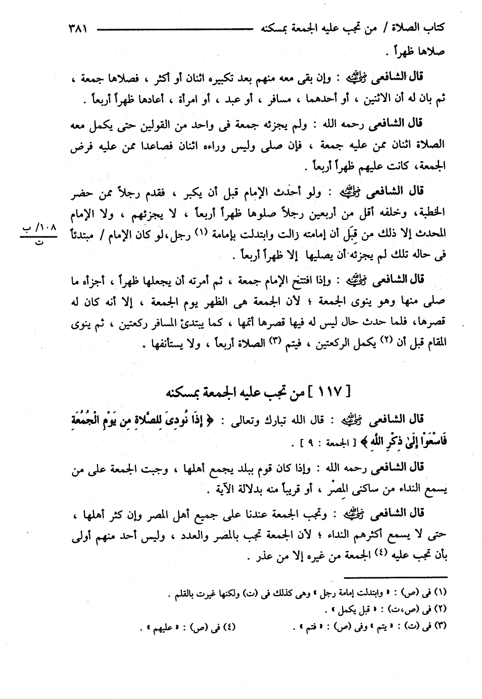قَالَ الشَّافِعِيُّ : رحمه الله تعالى قَالَ : اللَّهُ تَبَارَكَ وَتَعَالَى { إذَا نُودِيَ لِلصَّلاَةِ مِنْ يَوْمِ الْجُمُعَةِ فَاسْعَوْا إلَى ذِكْرِ اللَّهِ } ( قَالَ : الشَّافِعِيُّ ) : وَإِذَا كَانَ قَوْمٌ بِبَلَدٍ يُجْمِعُ أَهْلُهَا وَجَبَتْ الْجُمُعَةُ عَلَى مَنْ يَسْمَعُ النِّدَاءَ مِنْ سَاكِنِي الْمِصْرِ , أَوْ قَرِيبًا مِنْهُ بِدَلاَلَةِ الآيَةِ ( قَالَ : الشَّافِعِيُّ ) : وَتَجِبُ الْجُمُعَةُ عِنْدَنَا عَلَى جَمِيعِ أَهْلِ الْمِصْرِ وَإِنْ كَثُرَ أَهْلُهَا حَتَّى لاَ يَسْمَعَ أَكْثَرُهُمْ النِّدَاءَ ; لِأَنَّ الْجُمُعَةَ تَجِبُ بِالْمِصْرِ وَالْعَدَدِ , وَلَيْسَ أَحَدٌ مِنْهُمْ , أَوْلَى بِأَنْ تَجِبَ عَلَيْهِ الْجُمُعَةُ مِنْ غَيْرِهِ إلَّا مِنْ عُذْرٍ @