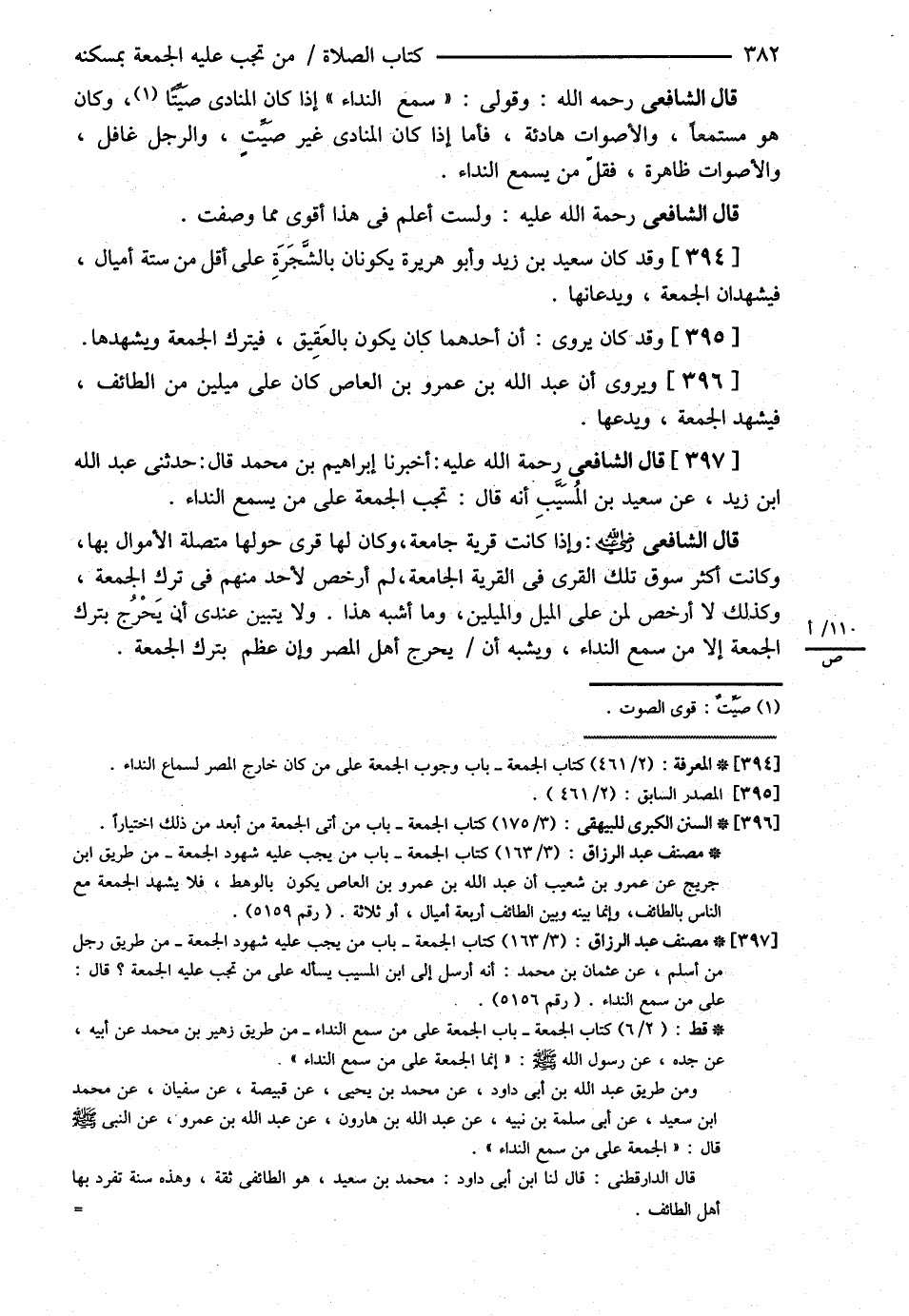 ( قَالَ : الشَّافِعِيُّ ) : وَقَوْلِي : سَمِعَ النِّدَاءَ إذَا كَانَ الْمُنَادِي صَيِّتًا وَكَانَ هُوَ مُسْتَمِعًا , وَالْأَصْوَاتُ هَادِئَةٌ فَأَمَّا إذَا كَانَ الْمُنَادِي غَيْرَ صَيِّتٍ وَالرَّجُلُ غَافِلٌ وَالْأَصْوَاتُ ظَاهِرَةٌ فَقَلَّ مَنْ يَسْمَعُ النِّدَاءَ . ( قَالَ : الشَّافِعِيُّ ) : وَلَسْت أَعْلَمُ فِي هَذَا أَقْوَى مِمَّا وَصَفْت وَقَدْ كَانَ سَعِيدُ بْنُ زَيْدٍ وَأَبُو هُرَيْرَةَ يَكُونَانِ بِالشَّجَرَةِ عَلَى أَقَلَّ مِنْ سِتَّةِ أَمْيَالٍ فَيَشْهَدَانِ الْجُمُعَةَ وَيَدَعَانِهَا وَقَدْ كَانَ يُرْوَى أَنَّ أَحَدَهُمَا كَانَ يَكُونُ بِالْعَقِيقِ فَيَتْرُكُ الْجُمُعَةَ وَيَشْهَدُهَا وَيُرْوَى أَنَّ عَبْدَ اللَّهِ بْنَ عَمْرِو بْنِ الْعَاصِ كَانَ عَلَى مِيلَيْنِ مِنْ الطَّائِفِ فَيَشْهَدُ الْجُمُعَةَ وَيَدَعُهَا