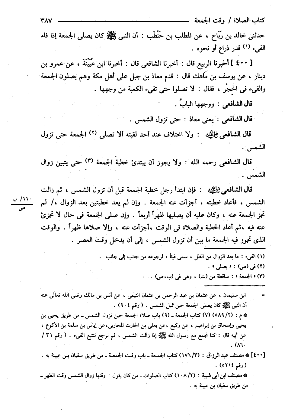 حَدَّثَنِي خَالِدُ بْنُ رَبَاحٍ عَنْ الْمُطَّلِبِ بْنِ حَنْطَبٍ { أَنَّ النَّبِيَّ - صلى الله عليه وسلم - كَانَ يُصَلِّي الْجُمُعَةَ إذَا فَاءَ الْفَيْءُ قَدْرَ ذِرَاعٍ , أَوْ نَحْوِهِ } , أَخْبَرَنَا الرَّبِيعُ قَالَ : أَخْبَرَنَا الشَّافِعِيُّ قَالَ : أَخْبَرَنَا ابْنُ عُيَيْنَةَ عَنْ عَمْرِو بْنِ دِينَارٍ عَنْ يُوسُفَ بْنِ مَاهَكَ قَالَ قَدِمَ مُعَاذُ بْنُ جَبَلٍ عَلَى أَهْلِ مَكَّةَ وَهُمْ يُصَلُّونَ الْجُمُعَةَ وَالْفَيْءُ فِي الْحِجْرِ فَقَالَ لاَ تُصَلُّوا حَتَّى تَفِيءَ الْكَعْبَةُ مِنْ وَجْهِهَا . ( قَالَ : الشَّافِعِيُّ ) : وَوَجْهُهَا الْبَابُ ( قَالَ : الشَّافِعِيُّ ) : يَعْنِي مُعَاذًا حَتَّى تَزُولَ الشَّمْسُ , ( قَالَ : الشَّافِعِيُّ ) : وَلاَ اخْتِلاَفَ عِنْدَ أَحَدٍ لَقِيته أَنْ لاَ تُصَلَّى الْجُمُعَةُ حَتَّى تَزُولَ الشَّمْسُ , ( قَالَ : الشَّافِعِيُّ ) : وَلاَ يَجُوزُ أَنْ يَبْتَدِئَ خُطْبَةَ الْجُمُعَةِ حَتَّى يَتَبَيَّنَ زَوَالَ الشَّمْسِ ( قَالَ : الشَّافِعِيُّ ) : فَإِنْ ابْتَدَأَ رَجُلٌ خُطْبَةَ الْجُمُعَةِ قَبْلَ أَنْ تَزُولَ الشَّمْسُ ثُمَّ زَالَتْ الشَّمْسُ فَأَعَادَ خُطْبَتَهُ أَجْزَأَتْ عَنْهُ الْجُمُعَةُ وَإِنْ لَمْ يُعِدْ خُطْبَتَيْنِ بَعْدَ الزَّوَالِ لَمْ تُجْزِ الْجُمُعَةُ عَنْهُ وَكَانَ عَلَيْهِ أَنْ يُصَلِّيَهَا ظُهْرًا أَرْبَعًا , وَإِنْ صَلَّى الْجُمُعَةَ فِي حَالٍ لاَ تُجْزِي عَنْهُ فِيهِ , ثُمَّ أَعَادَ الْخُطْبَةَ وَالصَّلاَةَ فِي الْوَقْتِ أَجْزَأَتْ عَنْهُ وَإِلَّا صَلَّاهَا ظُهْرًا وَالْوَقْتُ الَّذِي تَجُوزُ فِيهِ الْجُمُعَةُ مَا بَيْنَ أَنْ تَزُولَ الشَّمْسُ إلَى أَنْ يَدْخُلَ وَقْتُ الْعَصْرِ .@