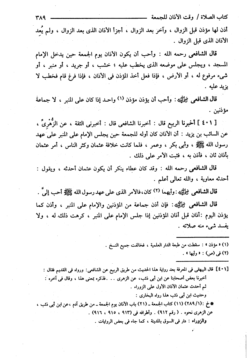 أَذَّنَ لَهَا مُؤَذِّنٌ قَبْلَ الزَّوَالِ وَآخَرُ بَعْدَ الزَّوَالِ أَجْزَأَ الْأَذَانُ الَّذِي بَعْدَ الزَّوَالِ وَلَمْ يُعَدْ الْأَذَانُ الَّذِي قَبْلَ الزَّوَالِ , ( قَالَ : الشَّافِعِيُّ ) : وَأُحِبُّ أَنْ يَكُونَ الْأَذَانُ يَوْمَ الْجُمُعَةِ حِينَ يَدْخُلُ الْإِمَامُ الْمَسْجِدَ وَيَجْلِسُ عَلَى مَوْضِعِهِ الَّذِي يَخْطُبُ عَلَيْهِ خَشَبٌ , أَوْ جَرِيدٌ أَوْ مِنْبَرٌ , أَوْ شَيْءٌ مَرْفُوعٌ لَهُ , أَوْ الْأَرْضُ فَإِذَا فَعَلَ أَخَذَ الْمُؤَذِّنُ فِي الْأَذَانِ فَإِذَا فَرَغَ قَامَ فَخَطَبَ لاَ يَزِيدُ عَلَيْهِ ( قَالَ : الشَّافِعِيُّ ) : وَأُحِبُّ أَنْ يُؤَذِّنَ مُؤَذِّنٌ وَاحِدٌ إذَا كَانَ عَلَى الْمِنْبَرِ لاَ جَمَاعَةُ مُؤَذِّنِينَ أَخْبَرَنَا الرَّبِيعُ قَالَ : أَخْبَرَنَا الشَّافِعِيُّ قَالَ : أَخْبَرَنِي الثِّقَةُ عَنْ الزُّهْرِيِّ عَنْ السَّائِبِ بْنِ يَزِيدَ أَنَّ الْأَذَانَ كَانَ أَوَّلُهُ لِلْجُمُعَةِ حِينَ يَجْلِسُ الْإِمَامُ عَلَى الْمِنْبَرِ عَلَى عَهْدِ رَسُولِ اللَّهِ - صلى الله عليه وسلم - وَأَبِي بَكْرٍ وَعُمَرَ فَلَمَّا كَانَتْ خِلاَفَةُ عُثْمَانَ وَكَثُرَ النَّاسُ أَمَرَ عُثْمَانَ بِأَذَانٍ ثَانٍ فَأُذِّنَ بِهِ فَثَبَتَ الْأَمْرُ عَلَى ذَلِكَ . ( قَالَ : الشَّافِعِيُّ ) : وَقَدْ كَانَ عَطَاءٌ يُنْكِرُ أَنْ يَكُونَ عُثْمَانُ أَحْدَثَهُ وَيَقُولُ أَحْدَثَهُ مُعَاوِيَةُ , وَاَللَّهُ تَعَالَى أَعْلَمُ . ( قَالَ : الشَّافِعِيُّ ) : وَأَيُّهُمَا كَانَ فَالْأَمْرُ الَّذِي عَلَى عَهْدِ رَسُولِ اللَّهِ - صلى الله عليه وسلم - أَحَبُّ إلَيَّ ( قَالَ : الشَّافِعِيُّ ) : فَإِنْ أَذَّنَ جَمَاعَةٌ مِنْ الْمُؤَذِّنِينَ وَالْإِمَامُ عَلَى الْمِنْبَرِ وَأُذِّنَ كَمَا يُؤَذَّنُ الْيَوْمَ أَذَانٌ قَبْلَ أَذَانِ الْمُؤَذِّنِينَ إذَا جَلَسَ الْإِمَامُ عَلَى الْمِنْبَرِ كَرِهْت ذَلِكَ لَهُ وَلاَ يُفْسِدُ شَيْءٌ مِنْهُ صَلاَتَهُ@