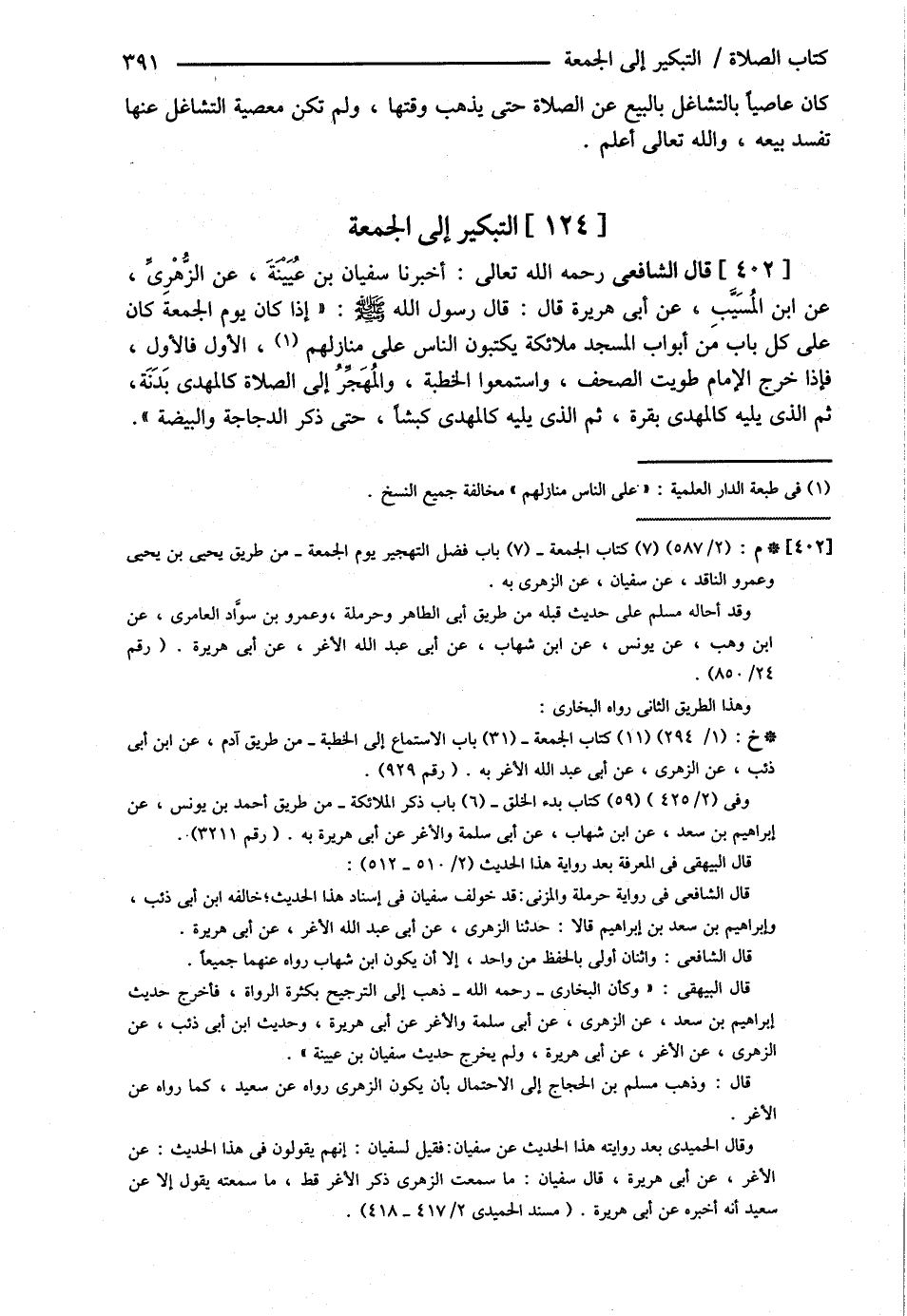 قَالَ الشَّافِعِيُّ : رحمه الله تعالى أَخْبَرَنَا سُفْيَانُ بْنُ عُيَيْنَةَ عَنْ الزُّهْرِيِّ عَنْ ابْنِ الْمُسَيِّبِ عَنْ أَبِي هُرَيْرَةَ قَالَ : قَالَ : رَسُولُ اللَّهِ - صلى الله عليه وسلم - { إذَا كَانَ يَوْمُ الْجُمُعَةِ كَانَ عَلَى كُلِّ بَابٍ مِنْ أَبْوَابِ الْمَسْجِدِ مَلاَئِكَةٌ يَكْتُبُونَ النَّاسَ عَلَى مَنَازِلِهِمْ الْأَوَّلَ فَالْأَوَّلَ فَإِذَا خَرَجَ الْإِمَامُ طُوِيَتْ الصُّحُفُ وَاسْتَمَعُوا الْخُطْبَةَ , وَالْمُهَجِّرُ إلَى الصَّلاَةِ كَالْمُهْدِي بَدَنَةً , ثُمَّ الَّذِي يَلِيه كَالْمُهْدِي بَقَرَةً , ثُمَّ الَّذِي يَلِيه كَالْمُهْدِي كَبْشًا , حَتَّى ذَكَرَ الدَّجَاجَةَ وَالْبَيْضَةَ } , @