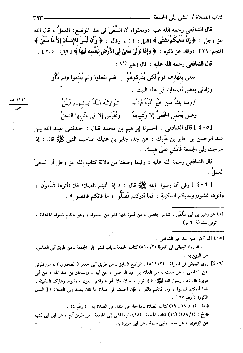 قَالَ الشَّافِعِيُّ: وَفِيمَا وَصَفْنَا مِنْ دَلاَلَةِ كِتَابِ اللَّهِ عَزَّ وَجَلَّ أَنَّ السَّعْيَ الْعَمَلُ وَفِي أَنَّ رَسُولَ اللَّهِ - صلى الله عليه وسلم - قَالَ: {إذَا أَتَيْتُمْ الصَّلاَةَ فَلاَ تَأْتُوهَا تَسْعَوْنَ وَائْتُوهَا تَمْشُونَ وَعَلَيْكُمْ السَّكِينَةُ فَمَا أَدْرَكْتُمْ فَصَلُّوا مَا فَاتَكُمْ فَاقْضُوا} @