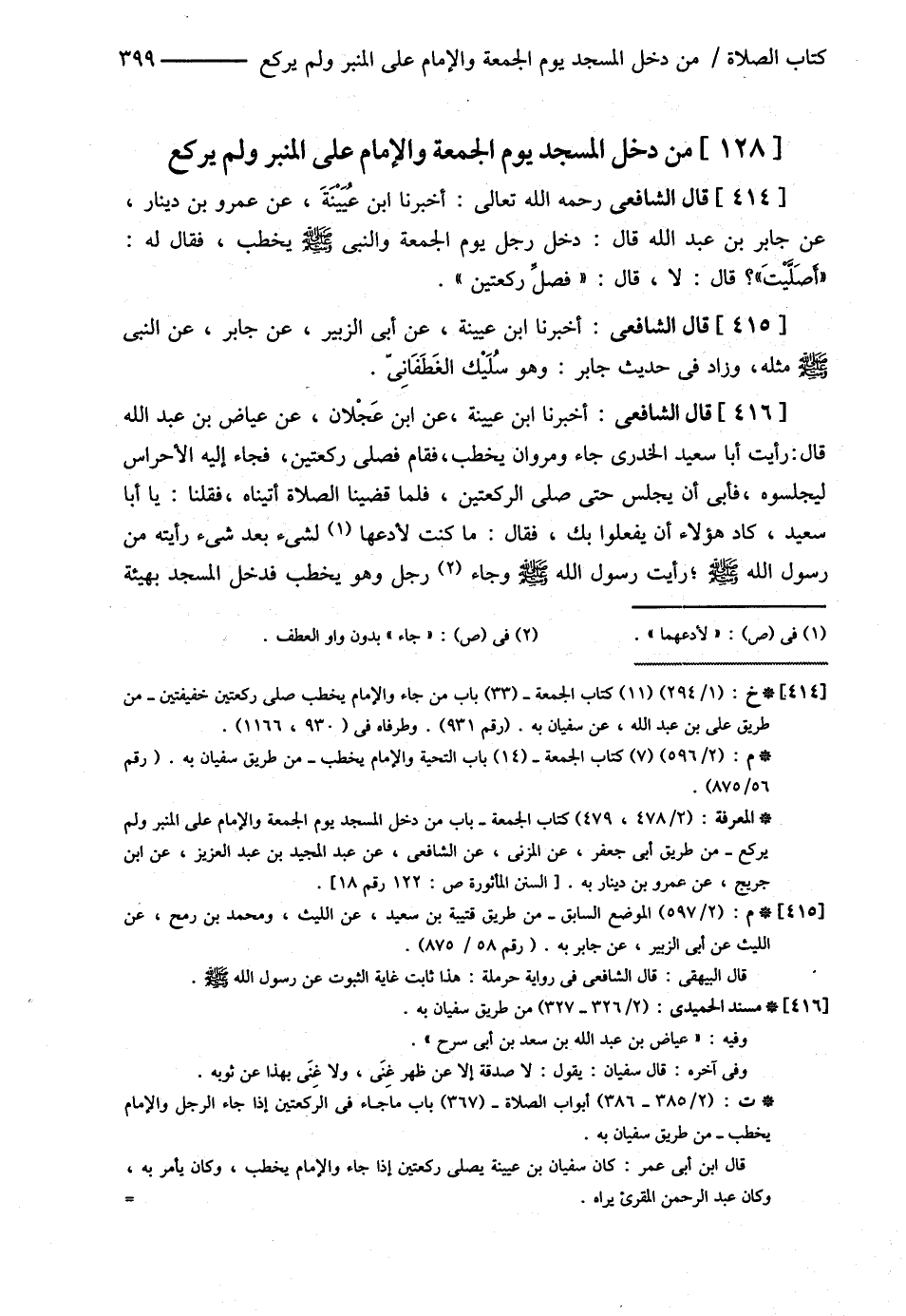 قَالَ الشَّافِعِيُّ : رحمه الله تعالى أَخْبَرَنَا ابْنُ عُيَيْنَةَ عَنْ عَمْرِو بْنِ دِينَارٍ عَنْ جَابِرِ بْنِ عَبْدِ اللَّهِ قَالَ : { دَخَلَ رَجُلٌ يَوْمَ الْجُمُعَةِ وَالنَّبِيُّ - صلى الله عليه وسلم - يَخْطُبُ فَقَالَ لَهُ : أَصَلَّيْت ؟ قَالَ لاَ قَالَ : فَصَلِّ رَكْعَتَيْنِ }