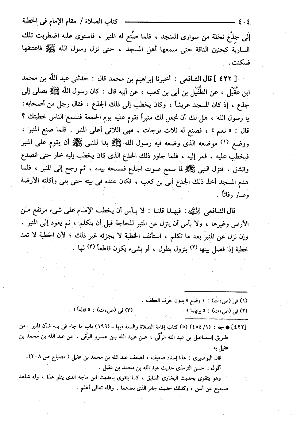 قَالَ الشَّافِعِيُّ : أَخْبَرَنَا إبْرَاهِيمُ بْنُ مُحَمَّدٍ قَالَ : حَدَّثَنِي عَبْدُ اللَّهِ بْنُ مُحَمَّدِ بْنِ عَقِيلٍ عَنْ الطُّفَيْلِ بْنِ أُبَيِّ بْنِ كَعْبٍ عَنْ أَبِيهِ قَالَ : { كَانَ رَسُولُ اللَّهِ - صلى الله عليه وسلم - . يُصَلِّي إلَى جِذْعٍ إذْ كَانَ الْمَسْجِدُ عَرِيشًا وَكَانَ يَخْطُبُ إلَى ذَلِكَ الْجِذْعِ فَقَالَ رَجُلٌ مِنْ أَصْحَابِهِ : يَا رَسُولَ اللَّهِ هَلْ لَك أَنْ نَجْعَلَ لَك مِنْبَرًا تَقُومُ عَلَيْهِ يَوْمَ الْجُمُعَةِ فَتَسْمَعَ النَّاسُ خُطْبَتَك ؟ قَالَ : نَعَمْ : فَصُنِعَ لَهُ ثَلاَثُ دَرَجَاتٍ فَهِيَ لِلْآتِي أَعْلَى الْمِنْبَرِ فَلَمَّا صُنِعَ الْمِنْبَرُ وَوُضِعَ مَوْضِعَهُ الَّذِي وَضَعَهُ فِيهِ رَسُولُ اللَّهِ - صلى الله عليه وسلم - بَدَا لِلنَّبِيِّ - صلى الله عليه وسلم - أَنْ يَقُومَ عَلَى الْمِنْبَرِ فَيَخْطُبَ عَلَيْهِ فَمَرَّ إلَيْهِ , فَلَمَّا جَاوَزَ ذَلِكَ الْجِذْعَ الَّذِي كَانَ يَخْطُبُ إلَيْهِ خَارَ حَتَّى انْصَدَعَ وَانْشَقَّ فَنَزَلَ النَّبِيُّ - صلى الله عليه وسلم - لَمَّا سَمِعَ صَوْتَ الْجِذْعِ فَمَسَحَهُ بِيَدِهِ , ثُمَّ رَجَعَ إلَى الْمِنْبَرِ } فَلَمَّا هُدِمَ الْمَسْجِدُ أَخَذَ ذَلِكَ الْجِذْعَ أُبَيّ بْنُ كَعْبٍ فَكَانَ عِنْدَهُ فِي بَيْتِهِ حَتَّى بَلِيَ وَأَكَلَتْهُ الْأَرَضَةُ وَصَارَ رُفَاتًا ( قَالَ : الشَّافِعِيُّ ) : فَبِهَذَا قُلْنَا لاَ بَأْسَ أَنْ يَخْطُبَ الْإِمَامُ عَلَى شَيْءٍ مُرْتَفِعٍ مِنْ الْأَرْضِ وَغَيْرِهَا وَلاَ بَأْسَ أَنْ يَنْزِلَ عَنْ الْمِنْبَرِ لِلْحَاجَةِ قَبْلَ أَنْ يَتَكَلَّمَ , ثُمَّ يَعُودَ إلَى الْمِنْبَرِ وَإِنْ نَزَلَ عَنْ الْمِنْبَرِ بَعْد مَا تَكَلَّمَ اسْتَأْنَفَ الْخُطْبَةَ لاَ يُجْزِئُهُ غَيْرُ ذَلِكَ ; لِأَنَّ الْخُطْبَةَ لاَ تُعَدُّ خُطْبَةً إذَا فَصَلَ بَيْنَهَا بِنُزُولٍ يَطُولُ , أَوْ بِشَيْءٍ يَكُونُ قَاطِعًا لَهَا .@