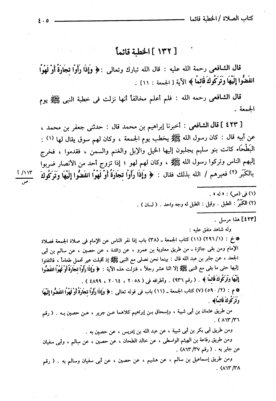 قَالَ الشَّافِعِيُّ : أَخْبَرَنَا إبْرَاهِيمُ بْنُ مُحَمَّدٍ قَالَ : حَدَّثَنِي جَعْفَرُ بْنُ مُحَمَّدٍ عَنْ أَبِيهِ قَالَ : { كَانَ رَسُولُ اللَّهِ - صلى الله عليه وسلم - يَخْطُبُ يَوْمَ الْجُمُعَةِ وَكَانَ لَهُمْ سُوقٌ يُقَالُ لَهَا الْبَطْحَاءُ , كَانَتْ بَنُو سُلَيْمٍ يَجْلِبُونَ إلَيْهَا الْخَيْلَ وَالْإِبِلَ وَالْغَنَمَ وَالسَّمْنَ فَقَدِمُوا فَخَرَجَ إلَيْهِمْ النَّاسُ وَتَرَكُوا رَسُولَ اللَّهِ - صلى الله عليه وسلم - وَكَانَ لَهُمْ لَهْوٌ إذَا تَزَوَّجَ أَحَدٌ مِنْ الْأَنْصَارِ ضَرَبُوا بِالْكَبَرِ فَعَيَّرَهُمْ اللَّهُ بِذَلِكَ فَقَالَ { : وَإِذَا رَأَوْا تِجَارَةً , أَوْ لَهْوًا انْفَضُّوا إلَيْهَا وَتَرَكُوك @