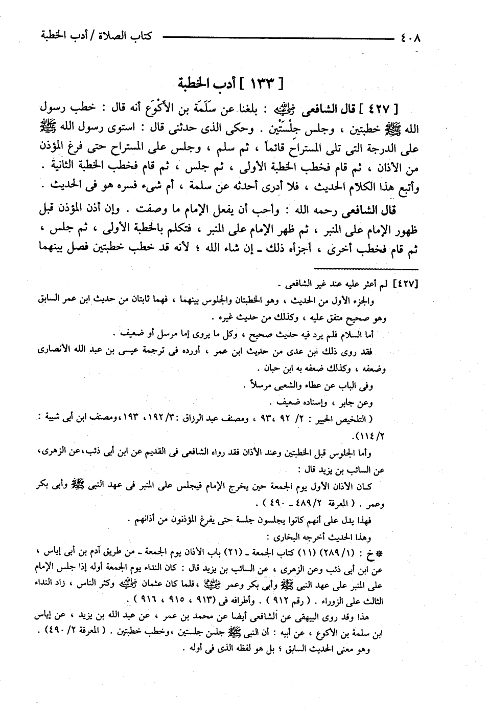 أَدَبُ الْخُطْبَةِ . ( قَالَ : الشَّافِعِيُّ ) : رحمه الله تعالى بَلَغَنَا عَنْ سَلَمَةَ بْنِ الْأَكْوَعِ أَنَّهُ قَالَ : { خَطَبَ رَسُولُ اللَّهِ - صلى الله عليه وسلم - خُطْبَتَيْنِ وَجَلَسَ جِلْسَتَيْنِ } وَحَكَى الَّذِي حَدَّثَنِي قَالَ : { : اسْتَوَى رَسُولُ اللَّهِ - صلى الله عليه وسلم - عَلَى الدَّرَجَةِ الَّتِي تَلِي الْمُسْتَرَاحَ قَائِمًا ثُمَّ سَلَّمَ وَجَلَسَ عَلَى الْمُسْتَرَاحِ حَتَّى فَرَغَ الْمُؤَذِّنُ مِنْ الْأَذَانِ , ثُمَّ قَامَ فَخَطَبَ الْخُطْبَةَ الْأُولَى , ثُمَّ جَلَسَ ثُمَّ قَامَ فَخَطَبَ الْخُطْبَةَ الثَّانِيَةَ } وَأَتْبَعَ هَذَا الْكَلاَمَ الْحَدِيثَ فَلاَ أَدْرِي أَحَدَّثَهُ عَنْ سَلَمَةَ أَمْ شَيْءٌ فَسَّرَهُ هُوَ فِي الْحَدِيثِ ( قَالَ : الشَّافِعِيُّ ) : وَأُحِبُّ أَنْ يَفْعَلَ الْإِمَامُ مَا وَصَفْت وَإِنْ أَذَّنَ الْمُؤَذِّنُ قَبْلَ ظُهُورِ الْإِمَامِ عَلَى الْمِنْبَرِ , ثُمَّ ظَهَرَ الْإِمَامُ عَلَى الْمِنْبَرِ فَتَكَلَّمَ بِالْخُطْبَةِ الْأُولَى , ثُمَّ جَلَسَ , ثُمَّ قَامَ فَخَطَبَ أُخْرَى أَجْزَأَهُ ذَلِكَ - إنْ شَاءَ اللَّهُ - لِأَنَّهُ قَدْ خَطَبَ خُطْبَتَيْنِ فَصَلَ بَيْنَهُمَا@