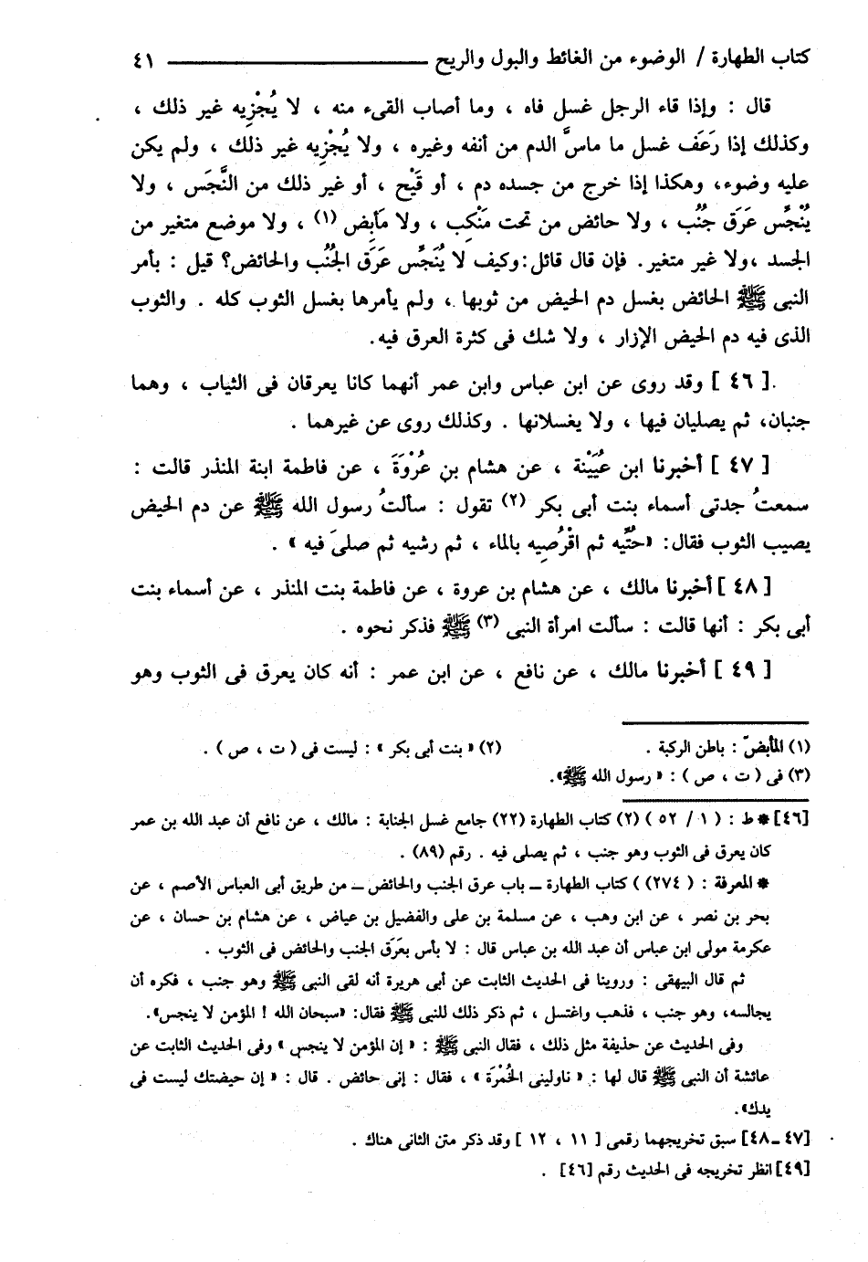 قَالَ : وَإِذَا قَاءَ الرَّجُلُ غَسَلَ فَاهُ وَمَا أَصَابَ الْقَيْءُ مِنْهُ لاَ يَجْزِيهِ غَيْرُ ذَلِكَ , وَكَذَلِكَ إذَا رَعَفَ غَسَلَ مَا مَاسَّ الدَّمُ مِنْ أَنْفِهِ وَغَيْرِهِ وَلاَ يَجْزِيهِ غَيْرُ ذَلِكَ وَلَمْ يَكُنْ عَلَيْهِ وُضُوءٌ , وَهَكَذَا إذَا خَرَجَ مِنْ جَسَدِهِ دَمٌ أَوْ قَيْحٌ أَوْ غَيْرُ ذَلِكَ مِنْ النَّجَسِ , وَلاَ يُنَجِّسُ عَرَقُ جُنُبٍ وَلاَ حَائِضٍ مِنْ تَحْتِ مَنْكِبٍ وَلاَ مَأْبِضٍ وَلاَ مَوْضِعٍ مُتَغَيِّرٍ مِنْ الْجَسَدِ وَلاَ غَيْرِ مُتَغَيِّرٍ , فَإِنْ قَالَ قَائِلٌ وَكَيْفَ لاَ يُنَجِّسُ عَرَقُ الْجُنُبِ وَالْحَائِضِ ؟ قِيلَ { أَمَرَ النَّبِيُّ - صلى الله عليه وسلم - الْحَائِضَ بِغَسْلِ دَمِ الْحَيْضِ مِنْ ثَوْبِهَا وَلَمْ يَأْمُرْهَا بِغَسْلِ الثَّوْبِ كُلِّهِ ? وَالثَّوْبُ الَّذِي فِيهِ دَمُ الْحَيْضِ الْإِزَارُ وَلاَ شَكَّ فِي كَثْرَةِ الْعَرَقِ فِيهِ وَقَدْ رُوِيَ عَنْ ابْنِ عَبَّاسٍ وَابْنِ عُمَرَ أَنَّهُمَا كَانَا يَعْرَقَانِ فِي الثِّيَابِ وَهُمَا جُنُبَانِ ثُمَّ يُصَلِّيَانِ فِيهَا وَلاَ يَغْسِلاَنِهَا وَكَذَلِكَ رُوِيَ عَنْ غَيْرِهِمَا أَخْبَرَنَا ابْنُ عُيَيْنَةَ عَنْ هِشَامِ بْنِ عُرْوَةَ عَنْ فَاطِمَةَ بِنْت الْمُنْذِرِ قَالَتْ سَمِعْت جَدَّتِي { أَسْمَاءَ بِنْتَ أَبِي بَكْرٍ تَقُولُ سَأَلْت رَسُولَ اللَّهِ - صلى الله عليه وسلم - عَنْ دَمِ الْحَيْضِ يُصِيبُ الثَّوْبَ فَقَالَ : حُتِّيهِ ثُمَّ اُقْرُصِيهِ بِالْمَاءِ ثُمَّ رُشِّيهِ ثُمَّ صَلِّي فِيهِ ? أَخْبَرَنَا مَالِكٌ عَنْ هِشَامِ بْنِ عُرْوَةَ عَنْ فَاطِمَةَ بِنْتِ الْمُنْذِرِ عَنْ أَسْمَاءَ بِنْتِ أَبِي بَكْرٍ أَنَّهَا قَالَتْ سَأَلَتْ امْرَأَةٌ النَّبِيَّ - صلى الله عليه وسلم - فَذَكَرَ نَحْوَهُ , أَخْبَرَنَا مَالِكٌ عَنْ نَافِعٍ عَنْ ابْنِ عُمَرَ أَنَّهُ كَانَ يَعْرَقُ فِي الثَّوْبِ وَهُوَ@