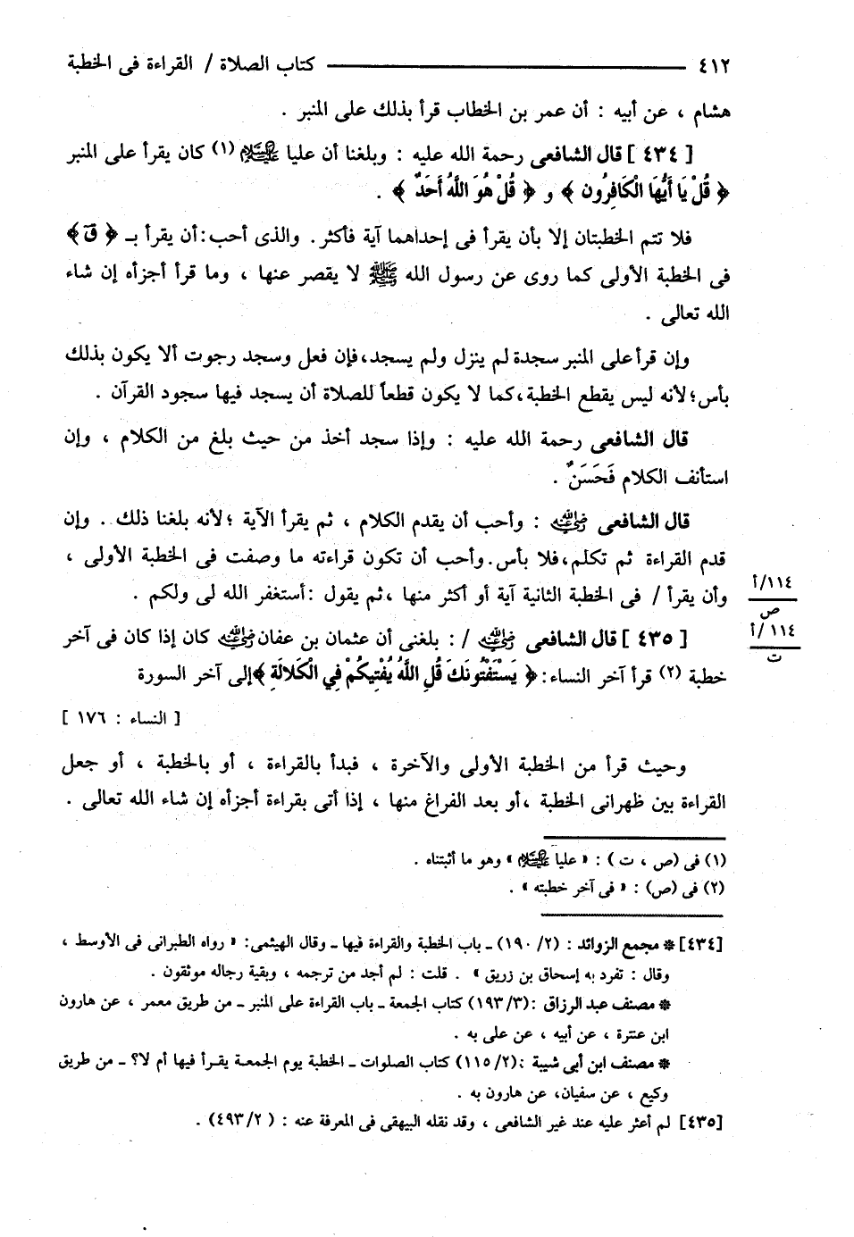 هِشَامٍ عَنْ أَبِيهِ أَنَّ عُمَرَ بْنَ الْخَطَّابِ قَرَأَ بِذَلِكَ عَلَى الْمِنْبَرِ . ( قَالَ : الشَّافِعِيُّ ) : وَبَلَغَنَا أَنَّ عَلِيًّا كَرَّمَ اللَّهُ وَجْهَهُ كَانَ يَقْرَأُ عَلَى الْمِنْبَرِ { قُلْ يَا أَيُّهَا الْكَافِرُونَ } وَ { قُلْ هُوَ اللَّهُ أَحَدٌ } فَلاَ تَتِمُّ الْخُطْبَتَانِ إلَّا بِأَنْ يَقْرَأَ فِي إحْدَاهُمَا آيَةً فَأَكْثَرَ وَاَلَّذِي أُحِبُّ أَنْ يَقْرَأَ بِ { ق } فِي الْخُطْبَةِ الْأُولَى كَمَا رُوِيَ عَنْ رَسُولِ اللَّهِ - صلى الله عليه وسلم - لاَ يُقَصِّرُ عَنْهَا وَمَا قَرَأَ أَجْزَأَهُ إنْ شَاءَ اللَّهُ تَعَالَى وَإِنْ قَرَأَ عَلَى الْمِنْبَرِ سَجْدَةً لَمْ يَنْزِلْ وَلَمْ يَسْجُدْ فَإِنْ فَعَلَ وَسَجَدَ رَجَوْت أَنْ لاَ يَكُونَ بِذَلِكَ بَأْسٌ ; لِأَنَّهُ لَيْسَ يَقْطَعُ الْخُطْبَةَ كَمَا لاَ يَكُونُ قَطْعًا لِلصَّلاَةِ أَنْ يَسْجُدَ فِيهَا سُجُودَ الْقُرْآنِ .