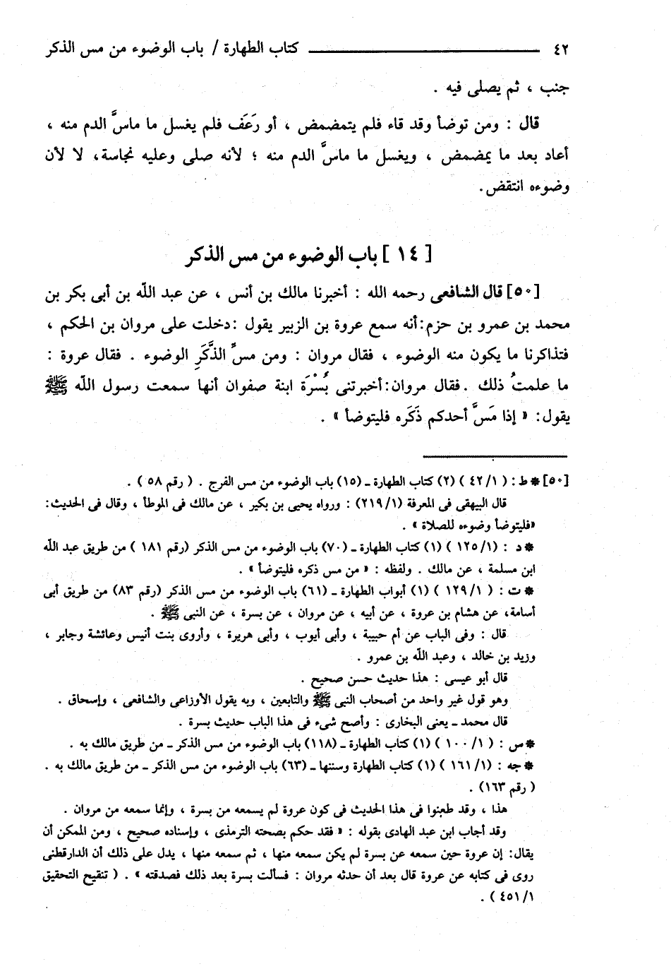 قَالَ الشَّافِعِيُّ : أَخْبَرَنَا مَالِكُ بْنُ أَنَسٍ عَنْ عَبْدِ اللَّهِ بْنِ أَبِي بَكْرِ بْنِ مُحَمَّدِ بْنِ عَمْرِو بْنِ حَزْم أَنَّهُ سَمِعَ عُرْوَةَ بْنَ الزُّبَيْرِ يَقُولُ : دَخَلْت عَلَى مَرْوَانَ بْنِ الْحَكَمِ فَتَذَاكَرْنَا مَا يَكُونُ مِنْهُ الْوُضُوءُ فَقَالَ مَرْوَانُ وَمِنْ مَسِّ الذَّكَرِ الْوُضُوءُ فَقَالَ عُرْوَةُ مَا عَلِمْتُ ذَلِكَ فَقَالَ مَرْوَانُ أَخْبَرَتْنِي بُسْرَةُ بِنْت صَفْوَانَ أَنَّهَا سَمِعَتْ رَسُولَ اللَّهِ - صلى الله عليه وسلم - يَقُولُ { إذَا مَسَّ أَحَدُكُمْ ذَكَرَهُ فَلْيَتَوَضَّأْ ?@