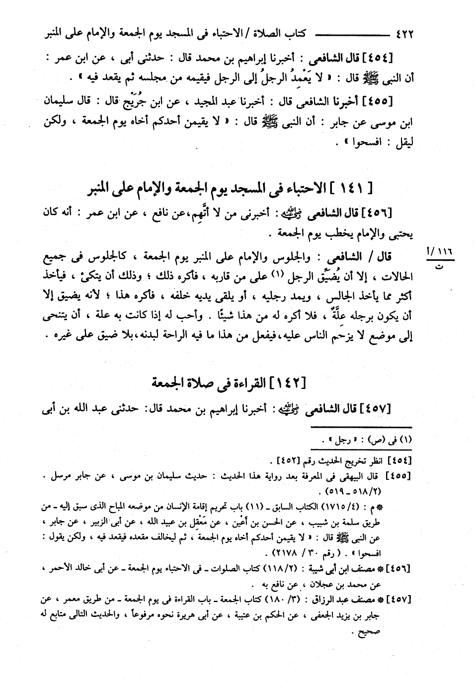 قَالَ الشَّافِعِيُّ : أَخْبَرَنَا إبْرَاهِيمُ بْنُ مُحَمَّدٍ قَالَ حَدَّثَنِي أُبَيٌّ عَنْ ابْنِ عُمَرَ أَنَّ النَّبِيَّ - صلى الله عليه وسلم - قَالَ : { لاَ يَعْمِدُ الرَّجُلُ إلَى الرَّجُلِ فَيُقِيمُهُ مِنْ مَجْلِسِهِ , ثُمَّ يَقْعُدُ فِيهِ } , أَخْبَرَنَا الشَّافِعِيُّ قَالَ أَخْبَرَنَا عَبْدُ الْمَجِيدِ عَنْ ابْنِ جُرَيْجٍ قَالَ : قَالَ سُلَيْمَانُ بْنُ مُوسَى عَنْ جَابِرٍ أَنَّ النَّبِيَّ - صلى الله عليه وسلم - قَالَ : { لاَ يُقِيمَنَّ أَحَدُكُمْ أَخَاهُ يَوْمَ الْجُمُعَةِ وَلَكِنْ لِيَقُلْ أَفْسِحُوا } .