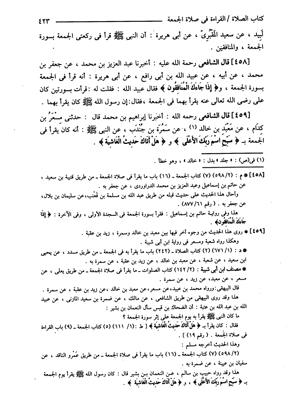 قَالَ الشَّافِعِيُّ : أَخْبَرَنَا إبْرَاهِيمُ بْنُ مُحَمَّدٍ قَالَ حَدَّثَنِي مِسْعَرُ بْنُ كِدَامٍ عَنْ مَعْبَدِ بْنِ خَالِدٍ عَنْ سَمُرَةَ بْنِ جُنْدُبٍ { عَنْ النَّبِيِّ - صلى الله عليه وسلم - أَنَّهُ كَانَ يَقْرَأُ فِي الْجُمُعَةِ { سَبِّحْ اسْمَ رَبِّكَ الْأَعْلَى } وَ { هَلْ أَتَاكَ حَدِيثُ الْغَاشِيَةِ } }@