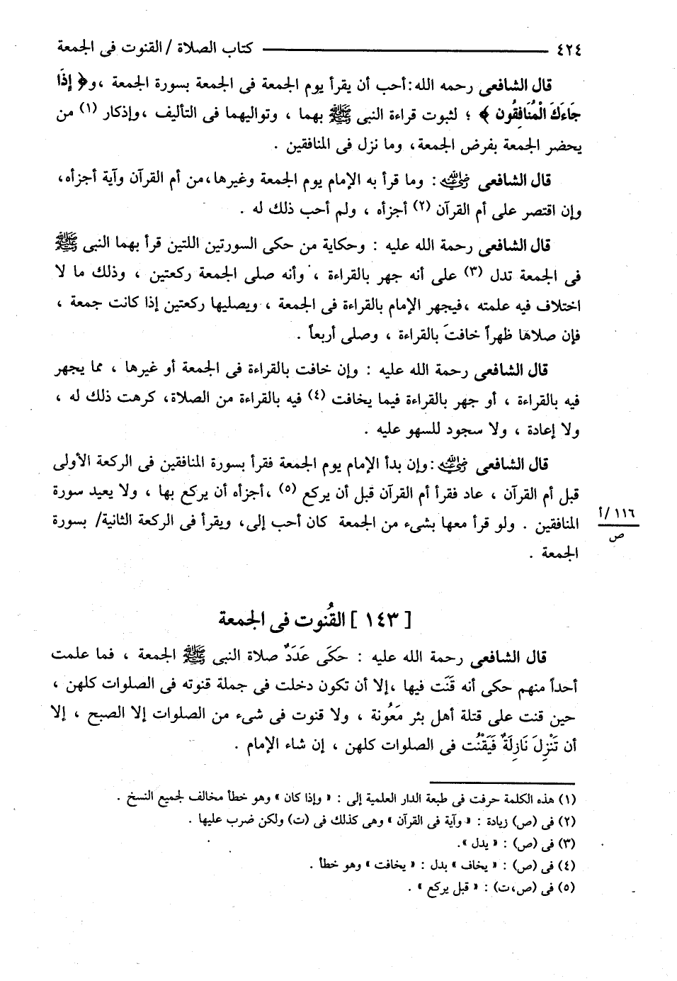 قَالَ الشَّافِعِيُّ : رحمه الله تعالى حَكَى عَدَدٌ صَلاَةَ النَّبِيِّ - صلى الله عليه وسلم - الْجُمُعَةَ فَمَا عَلِمْت أَحَدًا مِنْهُمْ حَكَى أَنَّهُ قَنَتَ فِيهَا إلَّا أَنْ تَكُونَ دَخَلَتْ فِي جُمْلَةِ قُنُوتِهِ فِي الصَّلَوَاتِ كُلِّهِنَّ حِينَ قَنَتَ عَلَى قَتَلَةِ أَهْلِ بِئْرِ مَعُونَةَ , وَلاَ قُنُوتَ فِي شَيْءٍ مِنْ الصَّلَوَاتِ إلَّا الصُّبْحَ إلَّا أَنْ تَنْزِلَ نَازِلَةٌ فَيُقْنَتَ فِي الصَّلَوَاتِ كُلِّهِنَّ إنْ شَاءَ الْإِمَامُ@