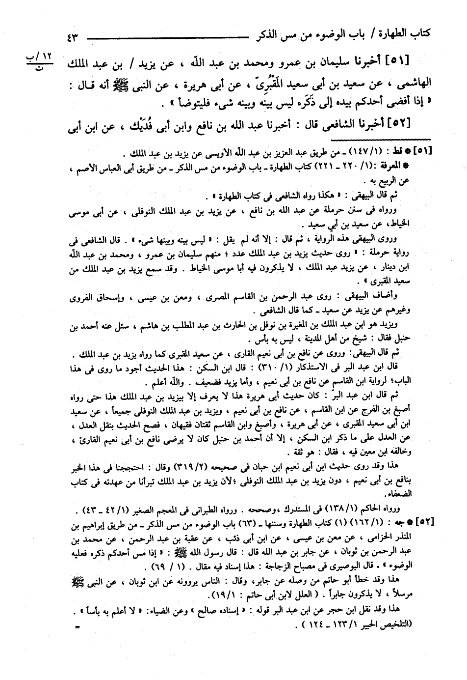 أَخْبَرَنَا سُلَيْمَانُ بْنُ عَمْرٍو وَمُحَمَّدُ بْنُ عَبْدِ اللَّهِ عَنْ يَزِيدَ بْنِ عَبْدِ الْمَلِكِ الْهَاشِمِيِّ عَنْ سَعِيدِ بْنِ أَبِي سَعِيدٍ الْمَقْبُرِيِّ عَنْ أَبِي هُرَيْرَةَ عَنْ النَّبِيِّ - صلى الله عليه وسلم - أَنَّهُ قَالَ : { إذَا أَفْضَى أَحَدُكُمْ بِيَدِهِ إلَى ذَكَرِهِ لَيْسَ بَيْنَهُ وَبَيْنَهُ شَيْءٌ فَلْيَتَوَضَّأْ ? أَخْبَرَنَا الشَّافِعِيُّ قَالَ أَخْبَرَنَا عَبْدُ اللَّهِ بْنُ نَافِعٍ وَابْنُ أَبِي فُدَيْكٍ عَنْ ابْنِ أَبِي@