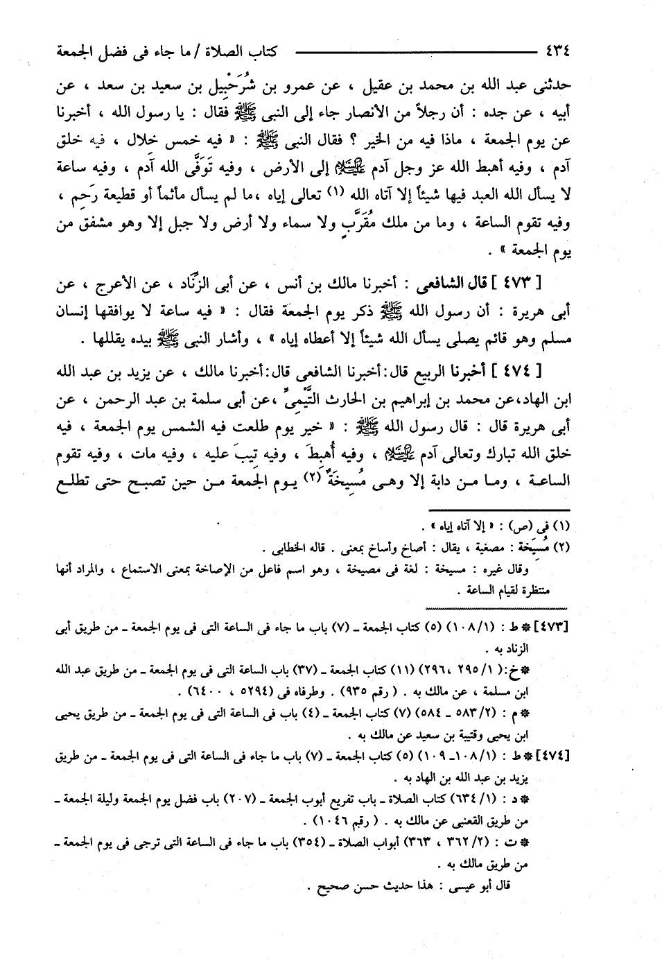 قَالَ الشَّافِعِيُّ : أَخْبَرَنَا مَالِكُ بْنُ أَنَسٍ عَنْ أَبِي الزِّنَادِ عَنْ الْأَعْرَجِ عَنْ أَبِي هُرَيْرَةَ { أَنَّ رَسُولَ اللَّهِ - صلى الله عليه وسلم - ذَكَرَ يَوْمَ الْجُمُعَةِ فَقَالَ : فِيهِ سَاعَةٌ لاَ يُوَافِقُهَا إنْسَانٌ مُسْلِمٌ , وَهُوَ قَائِمٌ يُصَلِّي يَسْأَلُ اللَّهَ شَيْئًا إلَّا أَعْطَاهُ إيَّاهُ , وَأَشَارَ النَّبِيُّ - صلى الله عليه وسلم - بِيَدِهِ يُقَلِّلُهَا } , أَخْبَرَنَا الرَّبِيعُ قَالَ أَخْبَرَنَا الشَّافِعِيُّ قَالَ أَخْبَرَنَا مَالِكٌ عَنْ يَزِيدَ بْنِ عَبْدِ اللَّهِ بْنِ الْهَادِ عَنْ مُحَمَّدِ بْنِ إبْرَاهِيمَ بْنِ الْحَارِثِ التَّيْمِيِّ عَنْ أَبِي سَلَمَةَ بْنِ عَبْدِ الرَّحْمَنِ عَنْ أَبِي هُرَيْرَةَ قَالَ : قَالَ رَسُولُ اللَّهِ - صلى الله عليه وسلم - { خَيْرُ يَوْمٍ طَلَعَتْ فِيهِ الشَّمْسُ يَوْمُ الْجُمُعَةِ , فِيهِ خَلَقَ اللَّهُ تَبَارَكَ وَتَعَالَى آدَمَ عليه السلام , وَفِيهِ أُهْبِطَ , وَفِيهِ تِيبَ عَلَيْهِ , وَفِيهِ مَاتَ وَفِيهِ تَقُومُ السَّاعَةُ , وَمَا مِنْ دَابَّةٍ إلَّا وَهِيَ مُسِيخَةٌ يَوْمَ الْجُمُعَةِ مِنْ حِينَ تُصْبِحُ حَتَّى تَطْلُعَ@