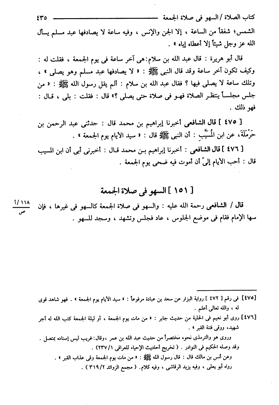 قَالَ الشَّافِعِيُّ : أَخْبَرَنَا إبْرَاهِيمُ بْنُ مُحَمَّدٍ قَالَ حَدَّثَنِي عَبْدُ الرَّحْمَنِ بْنُ حَرْمَلَةَ عَنْ ابْنِ الْمُسَيِّبِ أَنَّ النَّبِيَّ - صلى الله عليه وسلم - قَالَ { سَيِّدُ الْأَيَّامِ يَوْمُ الْجُمُعَةِ }