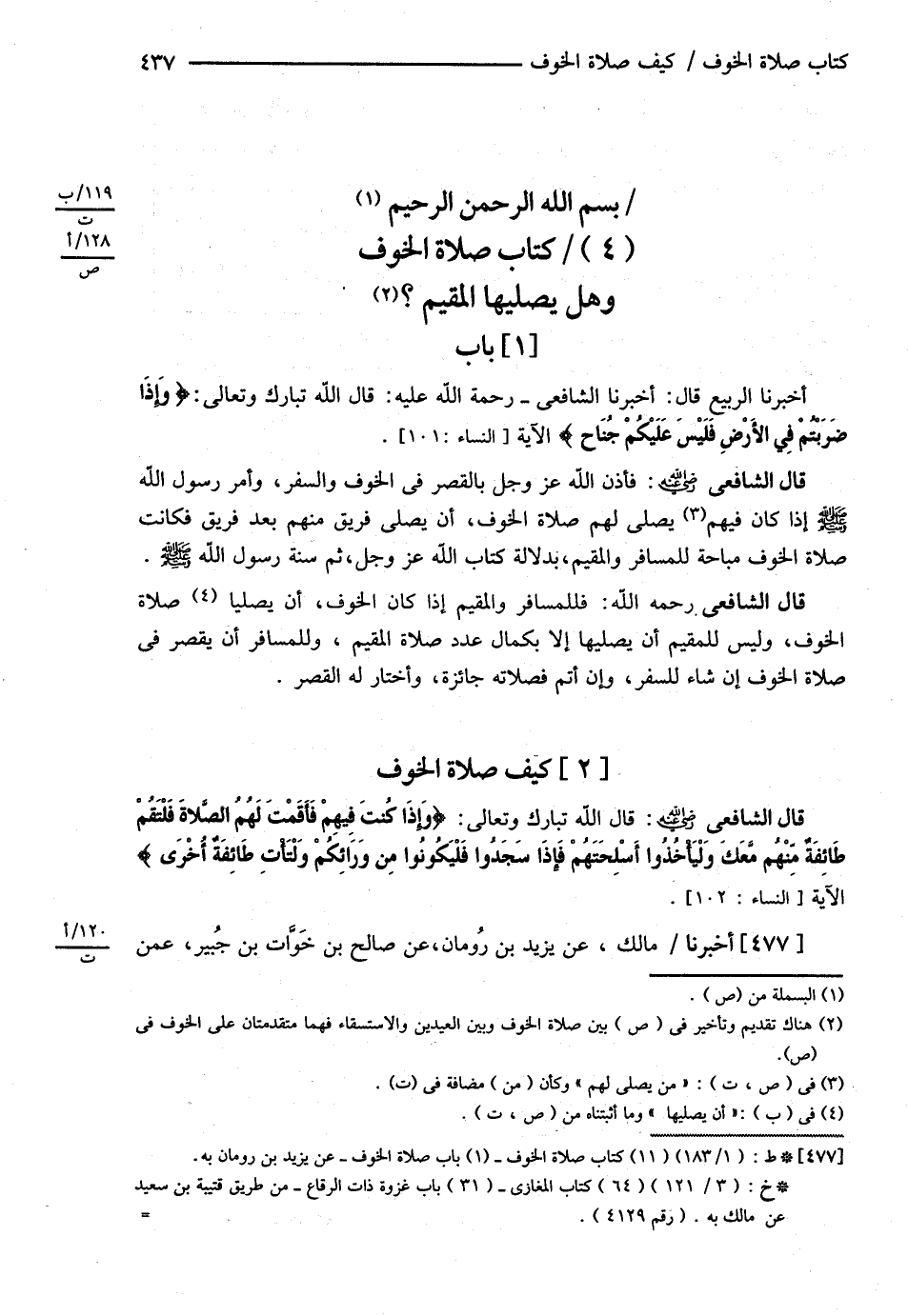 قَالَ الشَّافِعِيُّ: رحمه الله تعالى قَالَ اللَّهُ تَبَارَكَ وَتَعَالَى {, وَإِذَا كُنْتَ فِيهِمْ فَأَقَمْتَ لَهُمْ الصَّلاَةَ فَلْتَقُمْ طَائِفَةٌ مِنْهُمْ مَعَكَ وَلْيَأْخُذُوا أَسْلِحَتَهُمْ فَإِذَا سَجَدُوا فَلْيَكُونُوا مِنْ وَرَائِكُمْ , وَلْتَأْتِ طَائِفَةٌ أُخْرَى} الْآيَةُ , أَخْبَرَنَا مَالِكٌ عَنْ يَزِيدَ بْنِ رُومَانَ عَنْ صَالِحِ بْنِ خَوَّاتِ بْنِ جُبَيْرٍ عَمَّنْ@