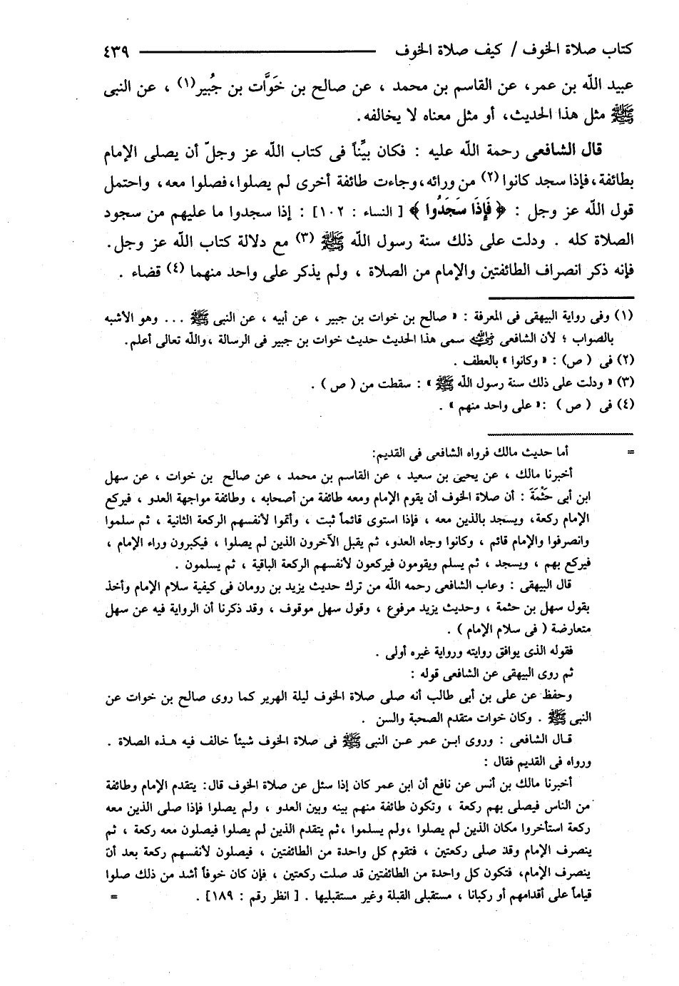 قَالَ الشَّافِعِيُّ: فَكَانَ بَيِّنًا فِي كِتَابِ اللَّهِ عَزَّ وَجَلَّ أَنْ يُصَلِّيَ الْإِمَامُ بِطَائِفَةٍ فَإِذَا سَجَدَ كَانُوا مِنْ وَرَائِهِ , وَجَاءَتْ طَائِفَةٌ أُخْرَى لَمْ يُصَلُّوا فَصَلَّوْا مَعَهُ , وَاحْتَمَلَ قَوْلُ اللَّهِ عَزَّ وَجَلَّ " فَإِذَا سَجَدُوا " إذَا سَجَدُوا مَا عَلَيْهِمْ مِنْ سُجُودِ الصَّلاَةِ كُلِّهِ , وَدَلَّتْ عَلَى ذَلِكَ سُنَّةُ رَسُولِ اللَّهِ - صلى الله عليه وسلم - مَعَ دَلاَلَةِ كِتَابِ اللَّهِ عَزَّ وَجَلَّ فَإِنَّهُ ذَكَرَ انْصِرَافَ الطَّائِفَتَيْنِ وَالْإِمَامِ مِنْ الصَّلاَةِ , وَلَمْ يَذْكُرْ عَلَى وَاحِدٍ مِنْهُمَا قَضَاءً@