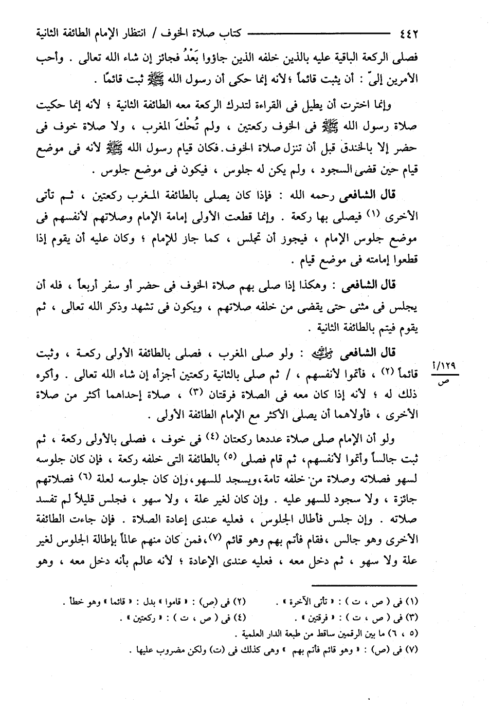 قَالَ الشَّافِعِيُّ : فَإِذَا كَانَ يُصَلِّي بِالطَّائِفَةِ الْمَغْرِبَ رَكْعَتَيْنِ ثُمَّ تَأْتِي الْأُخْرَى فَيُصَلِّي بِهَا رَكْعَةً , وَإِنَّمَا قَطَعَتْ الْأُولَى إمَامَةَ الْإِمَامِ , وَصَلاَتُهُمْ لِأَنْفُسِهِمْ فِي مَوْضِعِ جُلُوسِ الْإِمَامِ فَيَجُوزُ أَنْ يَجْلِسَ كَمَا جَازَ لِلْإِمَامِ وَكَانَ عَلَيْهِ أَنْ يَقُومَ إذَا قَطَعُوا إمَامَتَهُ فِي مَوْضِعِ قِيَامٍ .