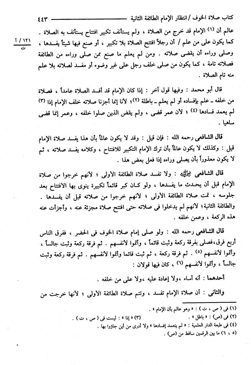 قَالَ الشَّافِعِيُّ : وَلاَ تَفْسُدُ صَلاَةُ الطَّائِفَةِ الْأُولَى لِأَنَّهُمْ خَرَجُوا مِنْ صَلاَةِ الْإِمَامِ قَبْلَ أَنْ يُحْدِثَ مَا يُفْسِدُهَا , وَلَوْ كَانَ كَبَّرَ قَائِمًا تَكْبِيرَةً يَنْوِي بِهَا الِافْتِتَاحَ بَعْدَ جُلُوسِهِ تَمَّتْ صَلاَةُ الطَّائِفَةِ الْأُولَى لِأَنَّهُمْ خَرَجُوا مِنْ صَلاَتِهِ قَبْلَ يُفْسِدَهَا , وَالطَّائِفَةِ الثَّانِيَةِ لِأَنَّهُمْ لَمْ يَدْخُلُوا فِي صَلاَتِهِ حَتَّى افْتَتَحَ صَلاَةً مُجْزِئَةً عَنْهُ , وَأَجْزَأَتْ عَنْهُ هَذِهِ الرَّكْعَةُ , وَعَمَّنْ خَلْفَهُ .