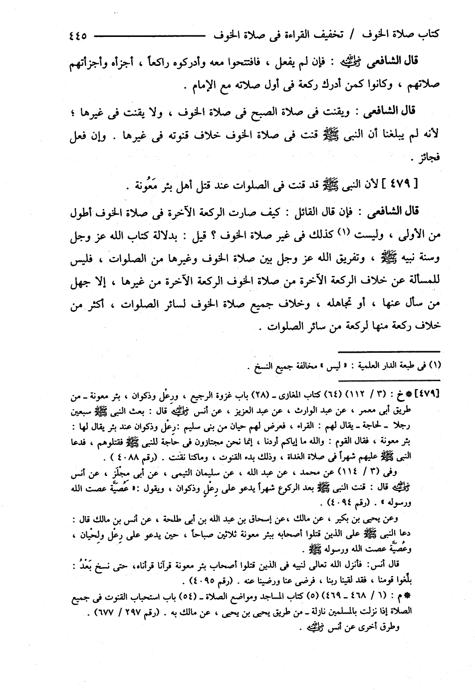 قَالَ الشَّافِعِيُّ: وَيَقْنُتُ فِي صَلاَةِ الصُّبْحِ فِي صَلاَةِ الْخَوْفِ , وَلاَ يَقْنُتُ فِي غَيْرِهَا لِأَنَّهُ لَمْ يَبْلُغْنَا أَنَّ النَّبِيَّ - صلى الله عليه وسلم - قَنَتَ فِي صَلاَةِ الْخَوْفِ قُنُوتَهُ فِي غَيْرِهَا , وَإِنْ فَعَلَ فَجَائِزٌ لِأَنَّ {النَّبِيَّ - صلى الله عليه وسلم - قَدْ قَنَتَ فِي الصَّلَوَاتُ عِنْدَ قَتْلِ أَهْلِ بِئْرِ مَعُونَةَ}