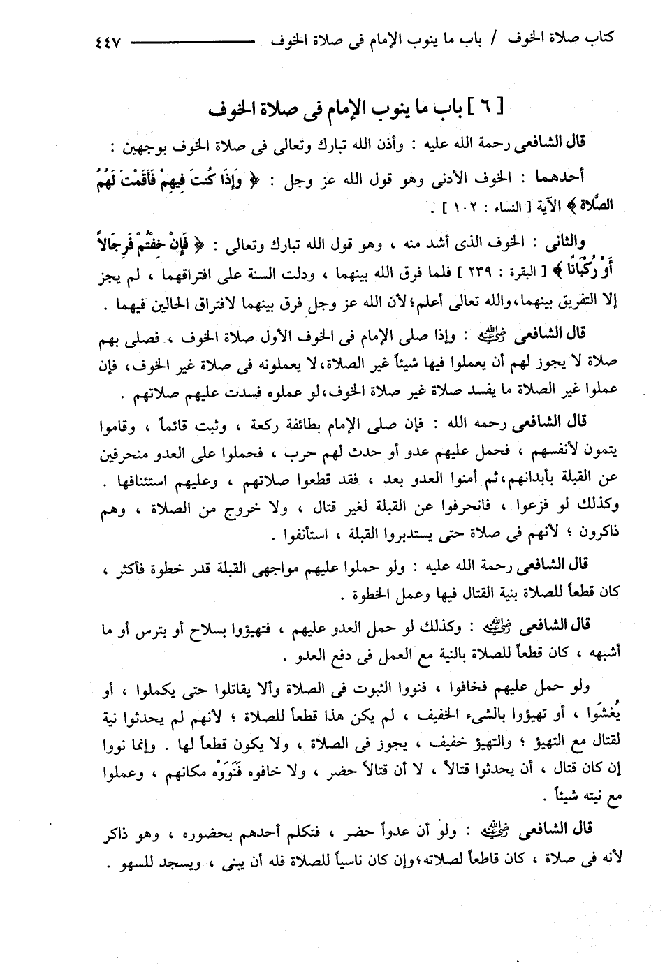 قَالَ الشَّافِعِيُّ : رحمه الله تعالى , وَأَذِنَ اللَّهُ تَبَارَكَ وَتَعَالَى فِي صَلاَةِ الْخَوْفِ بِوَجْهَيْنِ : أَحَدُهُمَا الْخَوْفُ الْأَدْنَى , وَهُوَ قَوْلُ اللَّهِ عَزَّ وَجَلَّ : ? , وَإِذَا كُنْتَ فِيهِمْ فَأَقَمْتَ لَهُمْ الصَّلاَةَ } الْآيَةُ , وَالثَّانِي الْخَوْفُ الَّذِي أَشَدُّ مِنْهُ , وَهُوَ قَوْلُ اللَّهِ تَبَارَكَ وَتَعَالَى { فَإِنْ خِفْتُمْ فَرِجَالاً أَوْ رُكْبَانًا } فَلَمَّا فَرَّقَ اللَّهُ بَيْنَهُمَا , وَدَلَّتْ السُّنَّةُ عَلَى افْتِرَاقِهِمَا لَمْ يَجُزْ إلَّا التَّفْرِيقُ بَيْنَهُمَا وَاَللَّهُ تَعَالَى أَعْلَمُ لِأَنَّ اللَّهَ عَزَّ وَجَلَّ فَرَّقَ بَيْنَهُمَا لِافْتِرَاقِ الْحَالَيْنِ فِيهِمَا