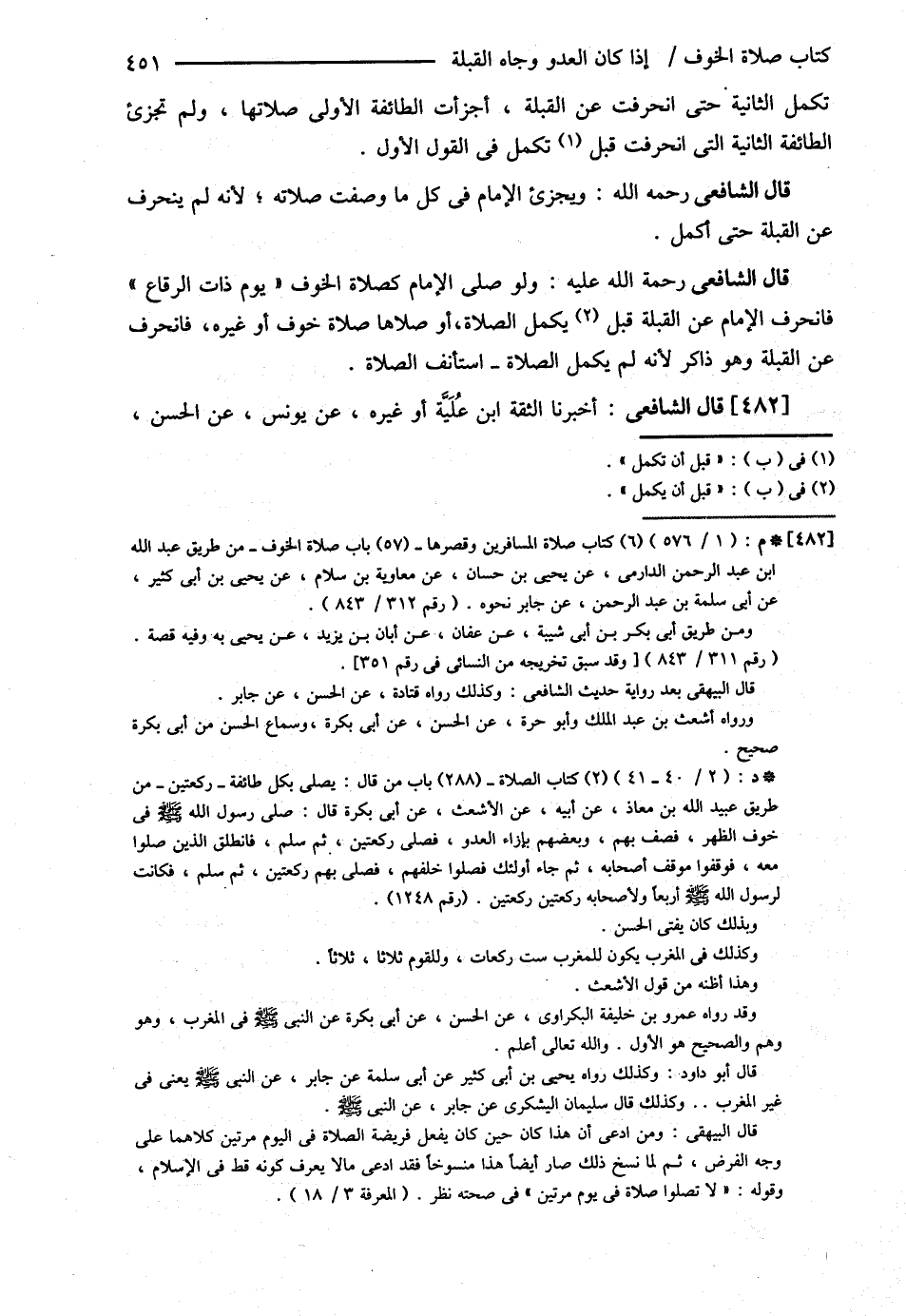 قَالَ الشَّافِعِيُّ : وَلَوْ صَلَّى الْإِمَامُ كَصَلاَةِ الْخَوْفِ " يَوْمَ ذَاتِ الرِّقَاعِ " فَانْحَرَفَ الْإِمَامُ عَنْ الْقِبْلَةِ قَبْلَ أَنْ يُكْمِلَ الصَّلاَةَ أَوْ صَلَّاهَا صَلاَةَ خَوْفٍ أَوْ غَيْرِهِ فَانْحَرَفَ عَنْ الْقِبْلَةِ , وَهُوَ ذَاكِرٌ لِأَنَّهُ لَمْ يُكْمِلْ الصَّلاَةَ اسْتَأْنَفَ الصَّلاَةَ
