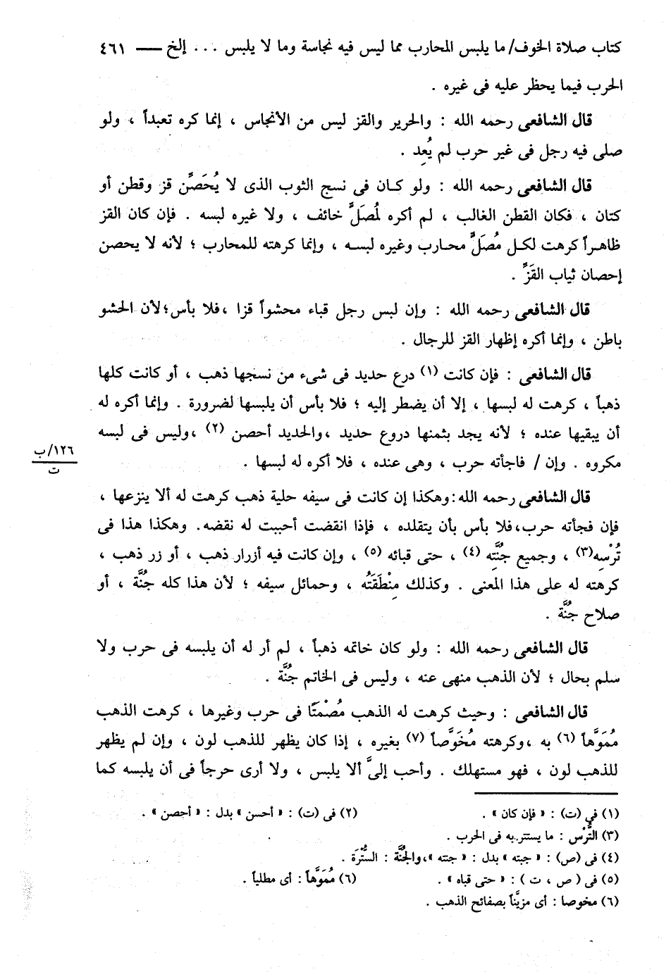 قَالَ الشَّافِعِيُّ : وَهَكَذَا إنْ كَانَتْ فِي سَيْفِهِ حِلْيَةُ ذَهَبٍ كَرِهْت لَهُ أَنْ لاَ يَنْزِعَهَا فَإِنْ فَجَأَتْهُ حَرْبٌ فَلاَ بَأْسَ بِأَنْ يَتَقَلَّدَهُ فَإِذَا انْقَضَتْ أَحْبَبْت لَهُ نَقْضَهُ , وَهَكَذَا هَذَا فِي تُرْسِهِ , وَجَمِيعِ جُنَّتِهِ حَتَّى قَبَائِهِ , وَإِنْ كَانَتْ فِيهِ أَزْرَارُ ذَهَبٍ أَوْ زِرُّ ذَهَبٍ كَرِهْتُهُ لَهُ عَلَى هَذَا الْمَعْنَى , وَكَذَلِكَ مِنْطَقَتُهُ , وَحَمَائِلُ سَيْفِهِ لِأَنَّ هَذَا كُلَّهُ جُنَّةٌ أَوْ صَلاَحُ جُنَّةٍ
