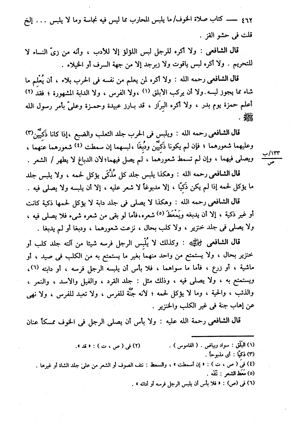 قَالَ الشَّافِعِيُّ : وَيَلْبَسُ فِي الْحَرْبِ جِلْدَ الثَّعْلَبِ , وَالضَّبُعِ إذَا كَانَا ذَكِيَّيْنِ وَعَلَيْهِمَا شُعُورُهُمَا فَإِنْ لَمْ يَكُونَا ذَكِيَّيْنِ , وَدُبِغَا لَبِسَهُمَا إنْ سُمِطَتْ شُعُورُهُمَا عَنْهُمَا , وَيُصَلِّي فِيهِمَا , وَإِنْ لَمْ نَسْمُطْ شُعُورَهُمَا لَمْ يُصَلِّ فِيهِمَا لِأَنَّ الدَّبَّاغَ لاَ يُطَهِّرُ الشَّعْرَ