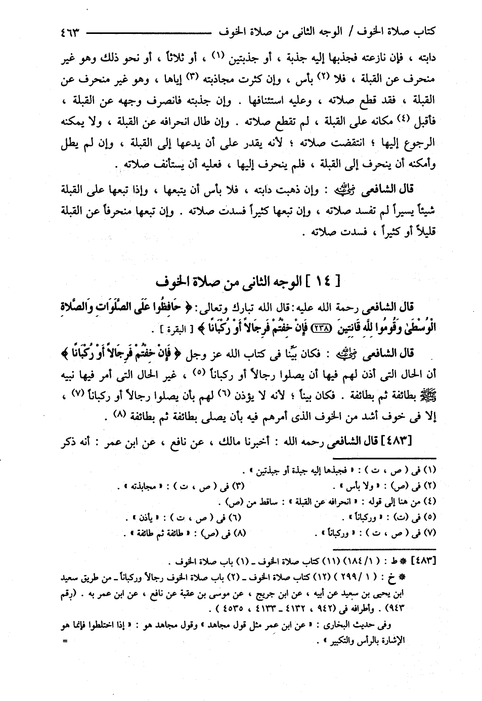 قَالَ الشَّافِعِيُّ: فَكَانَ بَيِّنًا فِي كِتَابِ اللَّهِ عَزَّ وَجَلَّ فَإِنْ خِفْتُمْ فَرِجَالاً أَوْ رُكْبَانًا أَنَّ الْحَالَ الَّتِي أَذِنَ لَهُمْ فِيهَا أَنْ يُصَلُّوا رِجَالاً أَوْ رُكْبَانًا غَيْرُ الْحَالِ الَّتِي أَمَرَ فِيهَا نَبِيَّهُ - صلى الله عليه وسلم - يُصَلِّي بِطَائِفَةٍ ثُمَّ بِطَائِفَةٍ فَكَانَ بَيِّنًا لِأَنَّهُ لاَ يُؤْذَنُ لَهُمْ بِأَنْ يُصَلُّوا رِجَالاً أَوْ رُكْبَانًا إلَّا فِي خَوْفٍ أَشَدَّ مِنْ الْخَوْفِ الَّذِي أَمَرَهُمْ فِيهِ بِأَنْ يُصَلِّيَ بِطَائِفَةٍ ثُمَّ بِطَائِفَةٍ