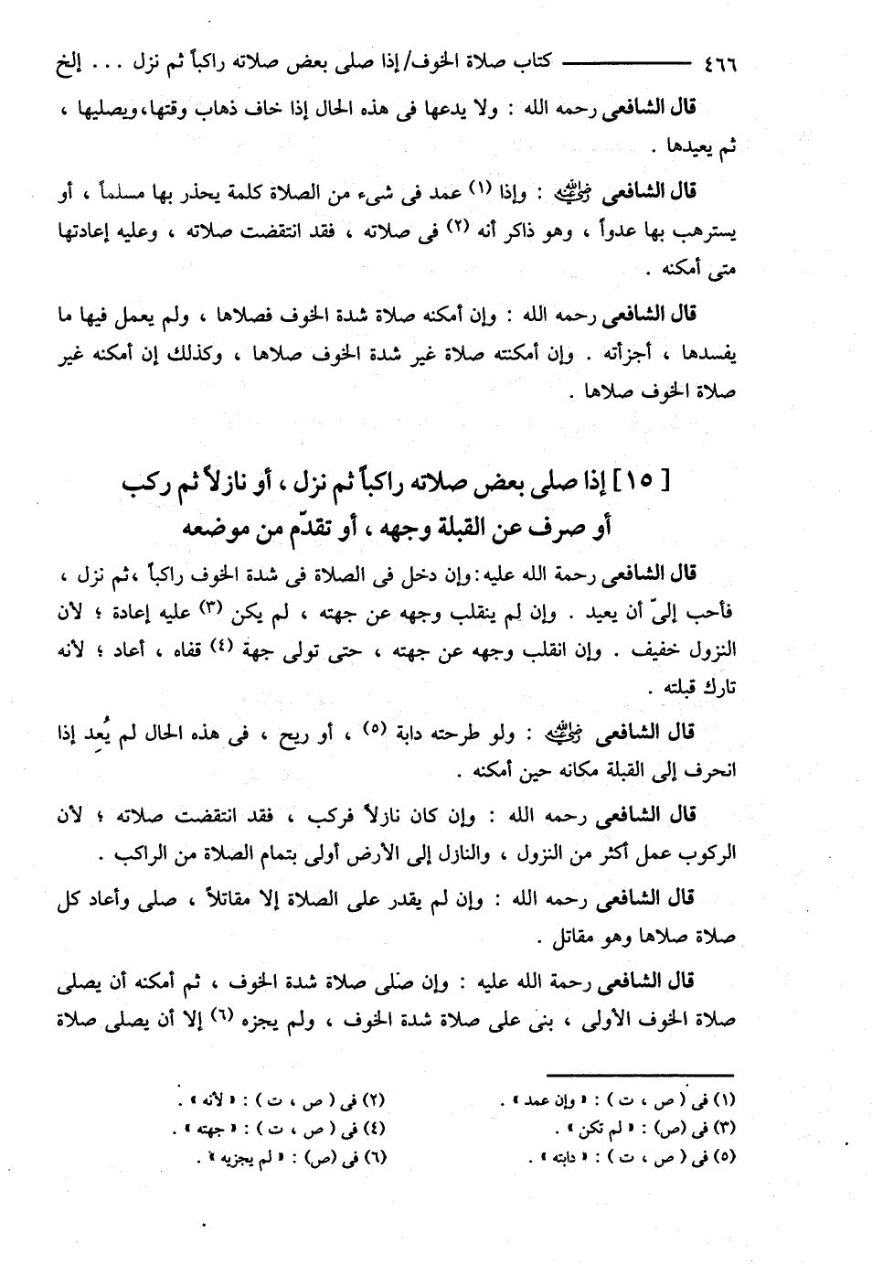 قَالَ الشَّافِعِيُّ : رحمه الله تعالى , وَإِنْ دَخَلَ فِي الصَّلاَةِ فِي شِدَّةِ الْخَوْفِ رَاكِبًا ثُمَّ نَزَلَ فَأَحَبُّ إلَيَّ أَنْ يُعِيدَ , وَإِنْ لَمْ يَنْقَلِبْ وَجْهُهُ عَنْ جِهَتِهِ لَمْ يَكُنْ عَلَيْهِ إعَادَةٌ لِأَنَّ النُّزُولَ خَفِيفٌ وَإِنْ انْقَلَبَ وَجْهُهُ عَنْ جِهَتِهِ حَتَّى تَوَلَّى جِهَةَ قَفَاهُ أَعَادَ لِأَنَّهُ تَارِكٌ قِبْلَتَهُ
