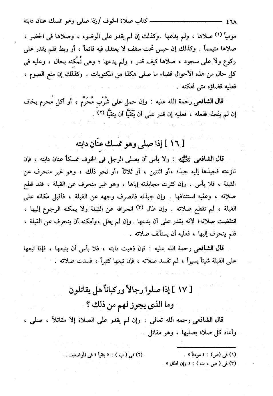 قَالَ الشَّافِعِيُّ : رحمه الله تعالى , وَلاَ بَأْسَ أَنْ يُصَلِّيَ الرَّجُلُ فِي الْخَوْفِ مُمْسِكًا عِنَانَ دَابَّتِهِ فَإِنْ نَازَعَتْهُ فَجَبَذَهَا إلَيْهِ جَبْذَةً أَوْ اثْنَتَيْنِ أَوْ ثَلاَثًا أَوْ نَحْوَ ذَلِكَ , وَهُوَ غَيْرُ مُنْحَرِفٍ عَنْ الْقِبْلَةِ فَلاَ بَأْسَ وَإِنْ كَثُرَتْ مجابذته إيَّاهَا , وَهُوَ غَيْرُ مُنْحَرِفٍ عَنْ الْقِبْلَةِ فَقَدْ قَطَعَ صَلاَتَهُ , وَعَلَيْهِ اسْتِئْنَافُهَا , وَإِنْ جَبَذَتْهُ فَانْصَرَفَ وَجْهُهُ عَنْ الْقِبْلَةِ فَأَقْبَلَ مَكَانَهُ عَلَى الْقِبْلَةِ لَمْ تُقْطَعْ صَلاَتُهُ , وَإِنْ طَالَ انْحِرَافُهُ عَنْ الْقِبْلَةِ , وَلاَ يُمْكِنُهُ الرُّجُوعُ إلَيْهَا انْتَقَضَتْ صَلاَتُهُ لِأَنَّهُ يَقْدِرُ عَلَى أَنْ يَدَعَهَا , وَإِنْ لَمْ يُطِلْ , وَأَمْكَنَهُ أَنْ يَنْحَرِفَ عَنْ الْقِبْلَةِ فَلَمْ يَنْحَرِفْ إلَيْهَا فَعَلَيْهِ أَنْ يَسْتَأْنِفَ صَلاَتَهُ