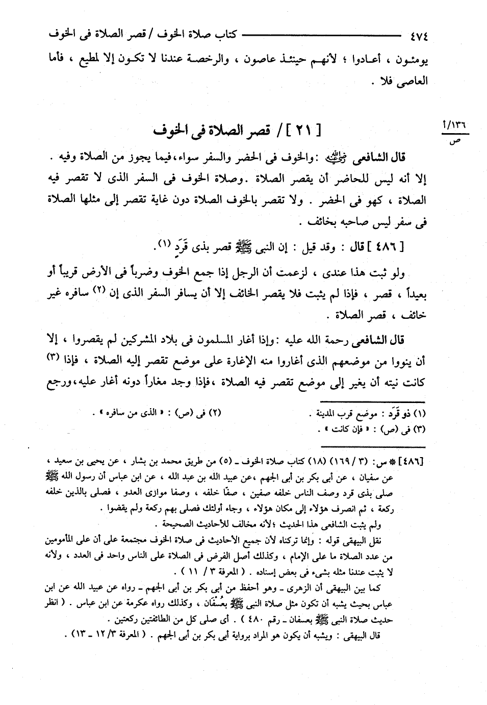 قال : وَقَدْ قِيلَ : إنَّ النَّبِيَّ - صلى الله عليه وسلم - قَصَرَ بِذِي قَرَدٍ , وَلَوْ ثَبَتَ هَذَا عِنْدِي لَزَعَمْت أَنَّ الرَّجُلَ إذَا جَمَعَ الْخَوْفَ , وَضَرْبًا فِي الْأَرْضِ , قَرِيبًا أَوْ بَعِيدًا , قَصَرَ فَإِذَا لَمْ يَثْبُتْ فَلاَ يَقْصُرُ الْخَائِفُ إلَّا أَنْ يُسَافِرَ السَّفَرَ الَّذِي إنْ سَافَرَهُ غَيْرُ خَائِفٍ قَصَرَ الصَّلاَةَ .