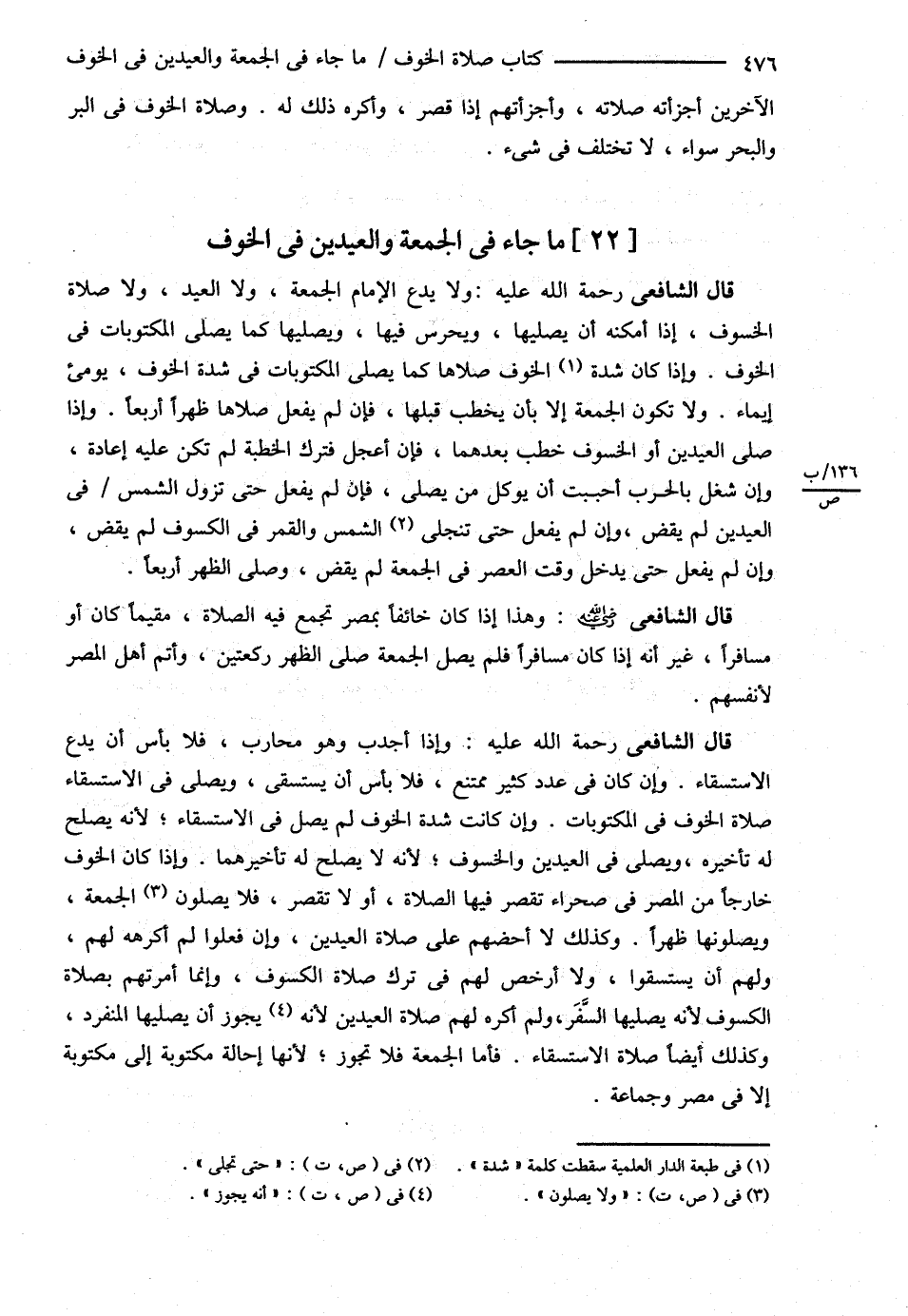 قَالَ الشَّافِعِيُّ : رحمه الله تعالى وَلاَ يَدَعُ الْإِمَامُ الْجُمُعَةَ , وَلاَ الْعِيدَ , وَلاَ صَلاَةَ الْخُسُوفِ إذْ أَمْكَنَهُ أَنْ يُصَلِّيَهَا وَيُحْرَسَ فِيهَا , وَيُصَلِّيهَا كَمَا يُصَلِّي الْمَكْتُوبَاتِ فِي الْخَوْفِ , وَإِذَا كَانَ شِدَّةَ الْخَوْفِ صَلَّاهَا كَمَا يُصَلِّي الْمَكْتُوبَاتِ فِي شِدَّةِ الْخَوْفِ يُومِئُ إيمَاءً , وَلاَ تَكُونُ الْجُمُعَةُ إلَّا بِأَنْ يَخْطُبَ قَبْلَهَا فَإِنْ لَمْ يَفْعَلْ صَلَّاهَا ظُهْرًا أَرْبَعًا , وَإِذَا صَلَّى الْعِيدَيْنِ أَوْ الْخُسُوفَ خَطَبَ بَعْدَهُمَا فَإِنْ أُعْجِلَ فَتَرَكَ الْخُطْبَةَ لَمْ تَكُنْ عَلَيْهِ إعَادَةٌ , وَإِنْ شُغِلَ بِالْحَرْبِ أَحْبَبْت أَنْ يُوَكِّلَ مَنْ يُصَلِّي , فَإِنْ لَمْ يَفْعَلْ حَتَّى تَزُولَ الشَّمْسُ فِي الْعِيدَيْنِ لَمْ يَقْضِ وَإِنْ لَمْ يَفْعَلْ حَتَّى تَنْجَلِيَ الشَّمْسُ , وَالْقَمَرُ فِي الْكُسُوفِ لَمْ يَقْضِ , وَإِنْ لَمْ يَفْعَلْ حَتَّى يَدْخُلَ , وَقْتُ الْعَصْرِ فِي الْجُمُعَةِ لَمْ يَقْضِ , وَصَلَّى الظُّهْرَ أَرْبَعًا