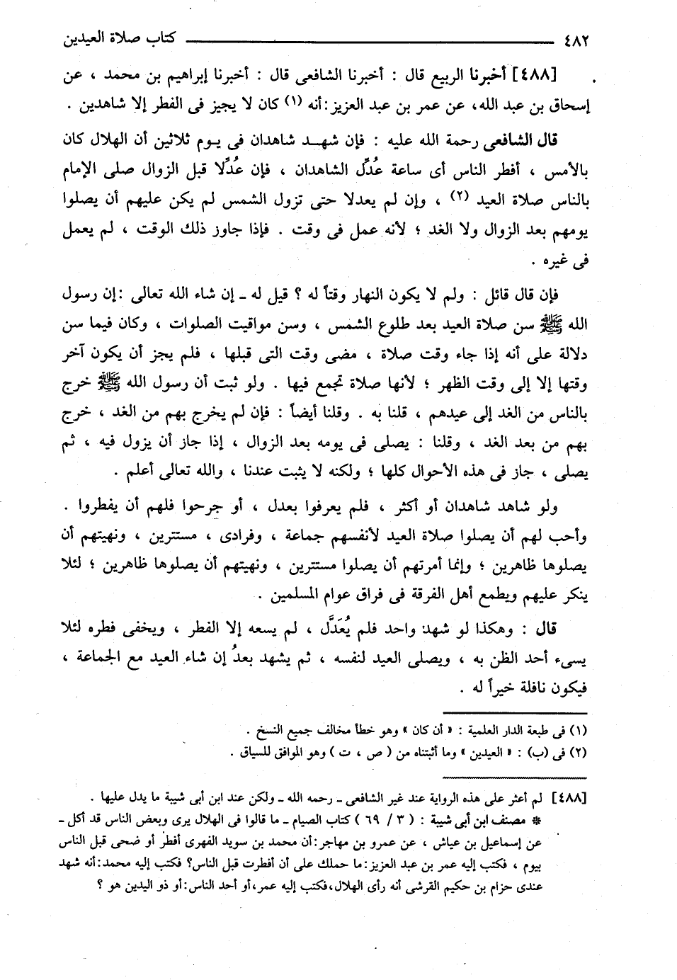 قَالَ الشَّافِعِيُّ : فَإِنْ شَهِدَ شَاهِدَانِ فِي يَوْمِ ثَلاَثِينَ أَنَّ الْهِلاَلَ كَانَ بِالْأَمْسِ , أَفْطَرَ النَّاسُ أَيْ سَاعَةَ عَدَلَ الشَّاهِدَانِ , فَإِنْ عَدَلاَ قَبْلَ الزَّوَالِ صَلَّى الْإِمَامُ بِالنَّاسِ صَلاَةَ الْعِيدَيْنِ وَإِنْ لَمْ يَعْدِلاَ حَتَّى تَزُولَ الشَّمْسُ لَمْ يَكُنْ عَلَيْهِمْ أَنْ يُصَلُّوا يَوْمَهُمْ بَعْدَ الزَّوَالِ , وَلاَ الْغَدَ لِأَنَّهُ عَمَلٌ فِي , وَقْتٍ فَإِذَا جَاوَزَ ذَلِكَ الْوَقْتَ لَمْ يُعْمَلْ فِي غَيْرِهِ , فَإِنْ قَالَ قَائِلٌ : وَلِمَ لاَ يَكُونُ النَّهَارُ وَقْتًا لَهُ ؟ قِيلَ لَهُ : إنْ شَاءَ اللَّهُ تَعَالَى إنَّ رَسُولَ اللَّهِ - صلى الله عليه وسلم - سَنَّ صَلاَةَ الْعِيدِ بَعْدَ طُلُوعِ الشَّمْسِ , وَسَنَّ مَوَاقِيتَ الصَّلاَةِ , وَكَانَ فِيمَا سُنَّ دَلاَلَةٌ عَلَى أَنَّهُ إذَا جَاءَ , وَقْتُ صَلاَةٍ مَضَى وَقْتُ الَّتِي قَبْلَهَا فَلَمْ يَجُزْ أَنْ يَكُونَ آخِرَ وَقْتِهَا إلَّا إلَى وَقْتِ الظُّهْرِ لِأَنَّهَا صَلاَةٌ تُجْمَعُ فِيهَا , وَلَوْ ثَبَتَ أَنَّ رَسُولَ اللَّهِ - صلى الله عليه وسلم - خَرَجَ بِالنَّاسِ مِنْ الْغَدِ إلَى عِيدِهِمْ قُلْنَا بِهِ , وَقُلْنَا أَيْضًا فَإِنْ لَمْ يَخْرُجْ بِهِمْ مِنْ الْغَدِ خَرَجَ بِهِمْ مِنْ بَعْدِ الْغَدِ , وَقُلْنَا يُصَلِّي فِي يَوْمِهِ بَعْدَ الزَّوَالِ إذَا جَازَ أَنْ يَزُولَ فِيهِ ثُمَّ يُصَلِّي جَازَ فِي هَذِهِ الْأَحْوَالِ كُلِّهَا , وَلَكِنَّهُ لاَ يَثْبُتُ عِنْدَنَا وَاَللَّهُ تَعَالَى أَعْلَمُ .