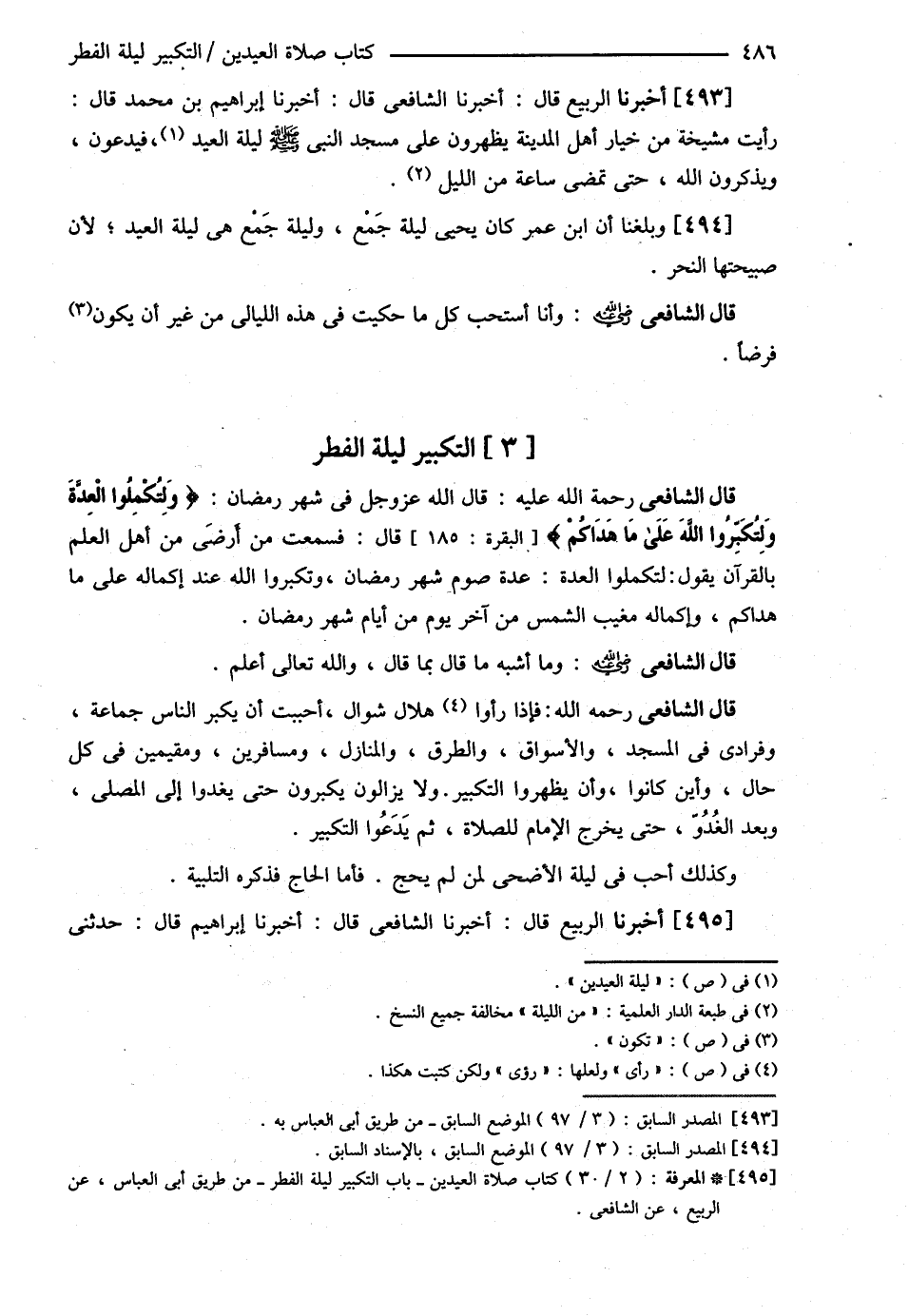 قَالَ الشَّافِعِيُّ : فَإِذَا رَأَوْا هِلاَلَ شَوَّالٍ أَحْبَبْتُ أَنْ يُكَبِّرَ النَّاسُ جَمَاعَةً , وَفُرَادَى فِي الْمَسْجِدِ وَالْأَسْوَاقِ , وَالطُّرُقِ , وَالْمَنَازِلِ , وَمُسَافِرِينَ , وَمُقِيمِينَ فِي كُلِّ حَالٍ , وَأَيْنَ كَانُوا , وَأَنْ يُظْهِرُوا التَّكْبِيرَ , وَلاَ يَزَالُونَ يُكَبِّرُونَ حَتَّى يَغْدُوَا إلَى الْمُصَلَّى , وَبَعْدَ الْغُدُوِّ حَتَّى يَخْرُجَ الْإِمَامُ لِلصَّلاَةِ ثُمَّ يَدَعُوا التَّكْبِيرَ , وَكَذَلِكَ أُحِبُّ فِي لَيْلَةِ الْأَضْحَى لِمَنْ لَمْ يَحُجَّ فَأَمَّا الْحَاجُّ فَذِكْرُهُ التَّلْبِيَةُ أَخْبَرَنَا الرَّبِيعُ قَالَ أَخْبَرَنَا الشَّافِعِيُّ قَالَ أَخْبَرَنَا إبْرَاهِيمُ قَالَ حَدَّثَنِي @