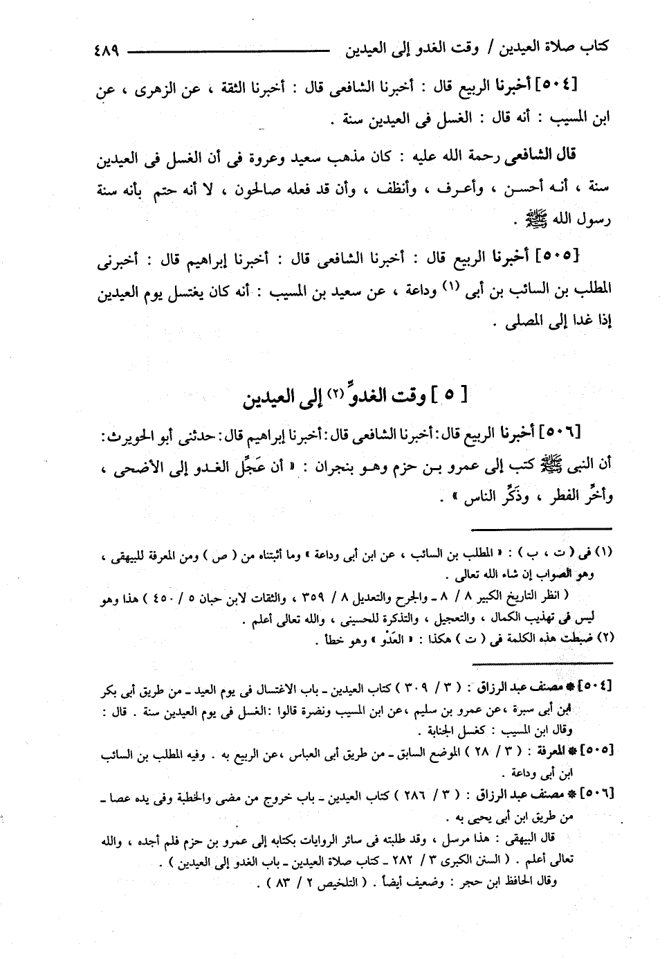 قَالَ الشَّافِعِيُّ : كَانَ مَذْهَبُ سَعِيدٍ وَعُرْوَةَ فِي أَنَّ الْغُسْلَ فِي الْعِيدَيْنِ سُنَّةٌ أَنَّهُ أَحْسَنُ وَأَعْرَفُ , وَأَنْظَفُ , وَأَنْ قَدْ فَعَلَهُ قَوْمٌ صَالِحُونَ لاَ أَنَّهُ حَتْمٌ بِأَنَّهُ سُنَّةُ رَسُولِ اللَّهِ - صلى الله عليه وسلم - أَخْبَرَنَا الرَّبِيعُ قَالَ أَخْبَرَنَا الشَّافِعِيُّ قَالَ أَخْبَرَنَا إبْرَاهِيمُ قَالَ أَخْبَرَنِي الْمُطَّلِبُ بْنُ السَّائِبِ عَنْ ابْنِ أَبِي وَدَاعَةَ عَنْ سَعِيدِ بْنِ الْمُسَيِّبِ أَنَّهُ كَانَ يَغْتَسِلُ يَوْمَ الْعِيدَيْنِ إذَا غَدَا إلَى الْمُصَلَّى .