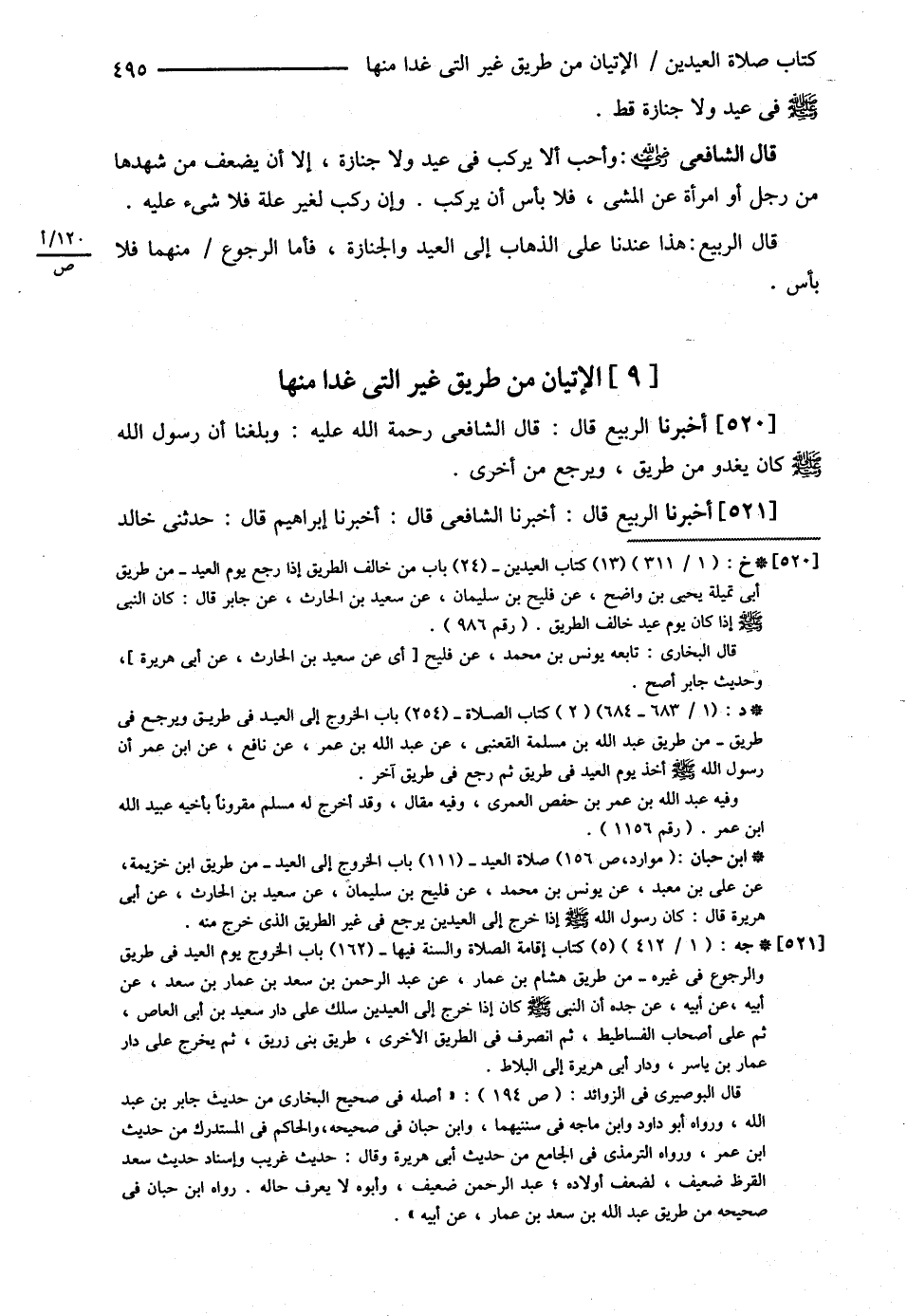 الْإِتْيَانُ مِنْ طَرِيقٍ غَيْرِ الَّتِي غَدَا مِنْهَا أَخْبَرَنَا الرَّبِيعُ قَالَ : قَالَ الشَّافِعِيُّ , وَبَلَغَنَا { أَنَّ رَسُولَ اللَّهِ - صلى الله عليه وسلم - كَانَ يَغْدُو مِنْ طَرِيقٍ وَيَرْجِعُ مِنْ أُخْرَى } فَأُحِبُّ ذَلِكَ لِلْإِمَامِ , وَالْعَامَّةِ , وَإِنْ غَدَوْا وَرَجَعُوا مِنْ طَرِيقٍ وَاحِدَةٍ فَلاَ شَيْءَ عَلَيْهِمْ إنْ شَاءَ اللَّهُ تَعَالَى أَخْبَرَنَا الرَّبِيعُ قَالَ أَخْبَرَنَا الشَّافِعِيُّ قَالَ أَخْبَرَنَا إبْرَاهِيمُ قَالَ حَدَّثَنِي خَالِدُ @